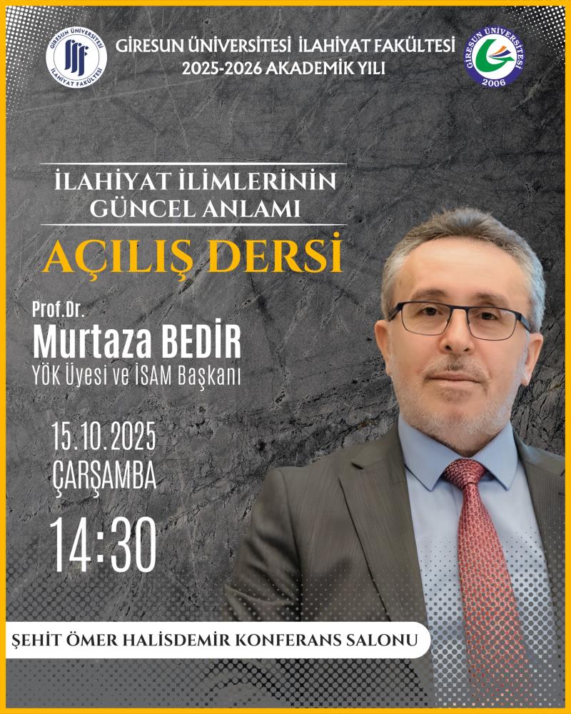 Giresun Üniversitesi İlahiyat Fakültesi tarafından düzenlenen 2025-2026 Akademik Yılı Açılış Dersi, Yükseköğretim Kurulu Üyesi ve İSAM Başkanı Prof. Dr. Murtaza BEDİR'in “İlahiyat İlimlerinin Güncel Anlamı” başlıklı sunumuyla, 15 Ekim 2025 Çarşamba günü saat 14.30'da, Güre Yerleşkesi Şehit Ömer Halisdemir Konferans Salonu'nda gerçekleştirilecektir.