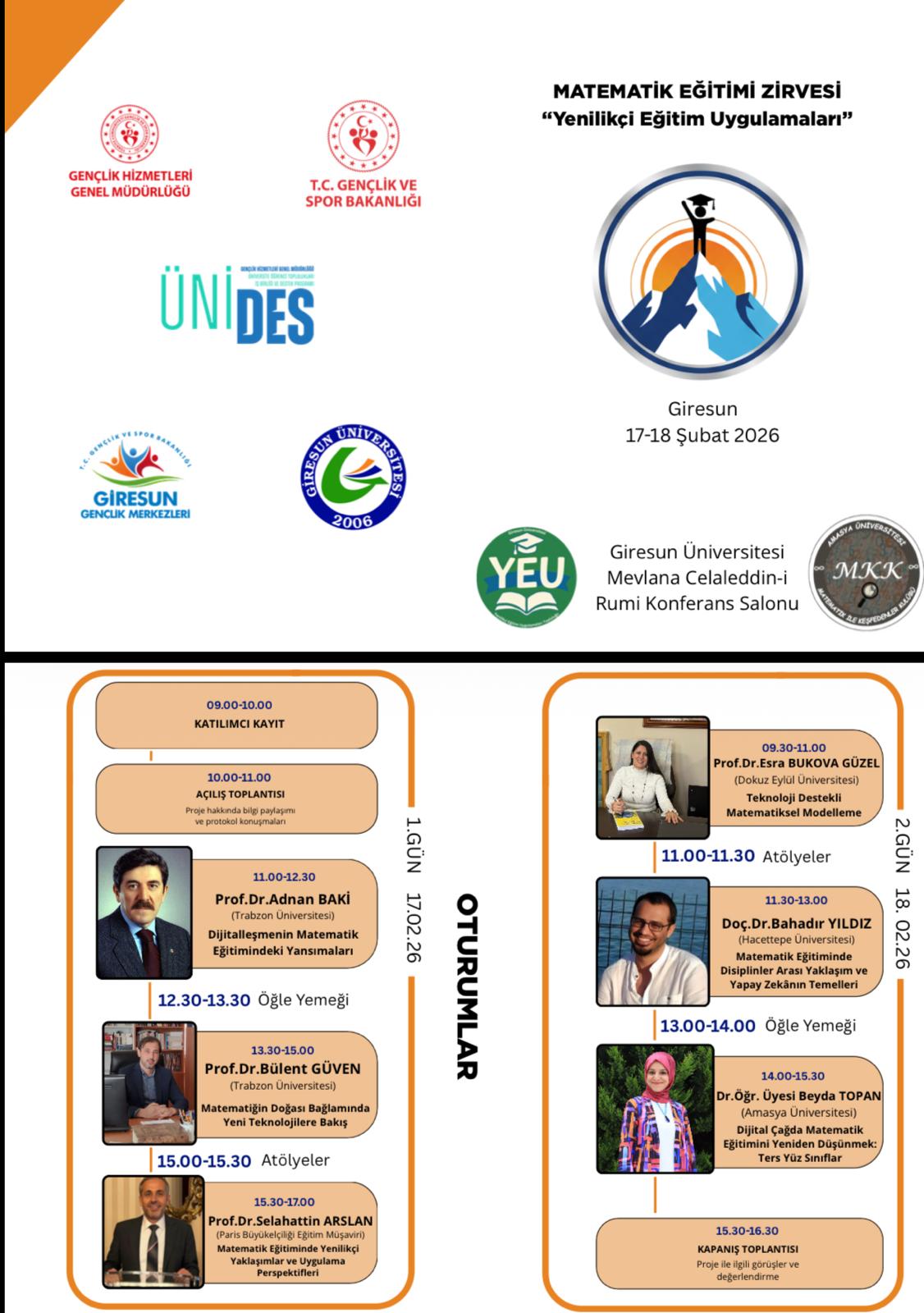 GRÜ Yenilikçi Eğitim Uygulamaları Topluluğunun UNİDES Programı tarafından desteklenmeye hak kazanan “Matematik Eğitimi Zirvesi” adlı proje kapsamında düzenleyecekleri ve Trabzon Üniversitesi Öğretim Üyeleri Prof. Dr. Adnan BAKİ, Prof. Dr. Bülent GÜVEN, Paris Büyükelçiliği Eğitim Müşaviri Prof. Dr. Selahattin ARSLAN, İzmir Dokuz Eylül Üniversitesi Öğretim Üyesi Prof. Dr. Esra BUKOVA GÜZEL, Hacettepe Üniversitesi Öğretim Üyesi Doç. Dr. Bahadır YILDIZ ve Amasya Üniversitesi Dr .Öğr .Üyesi Beyda TOPAN'ın konuşmacı olarak katılacaklar “Yenilikçi Eğitim Uygulamaları: Matematik Eğitimi Zirvesi”, 17-18 Şubat 2026 tarihleri arasında Mevlana Celaleddin-i Rumi Konferans Salonunda gerçekleştirilecektir.