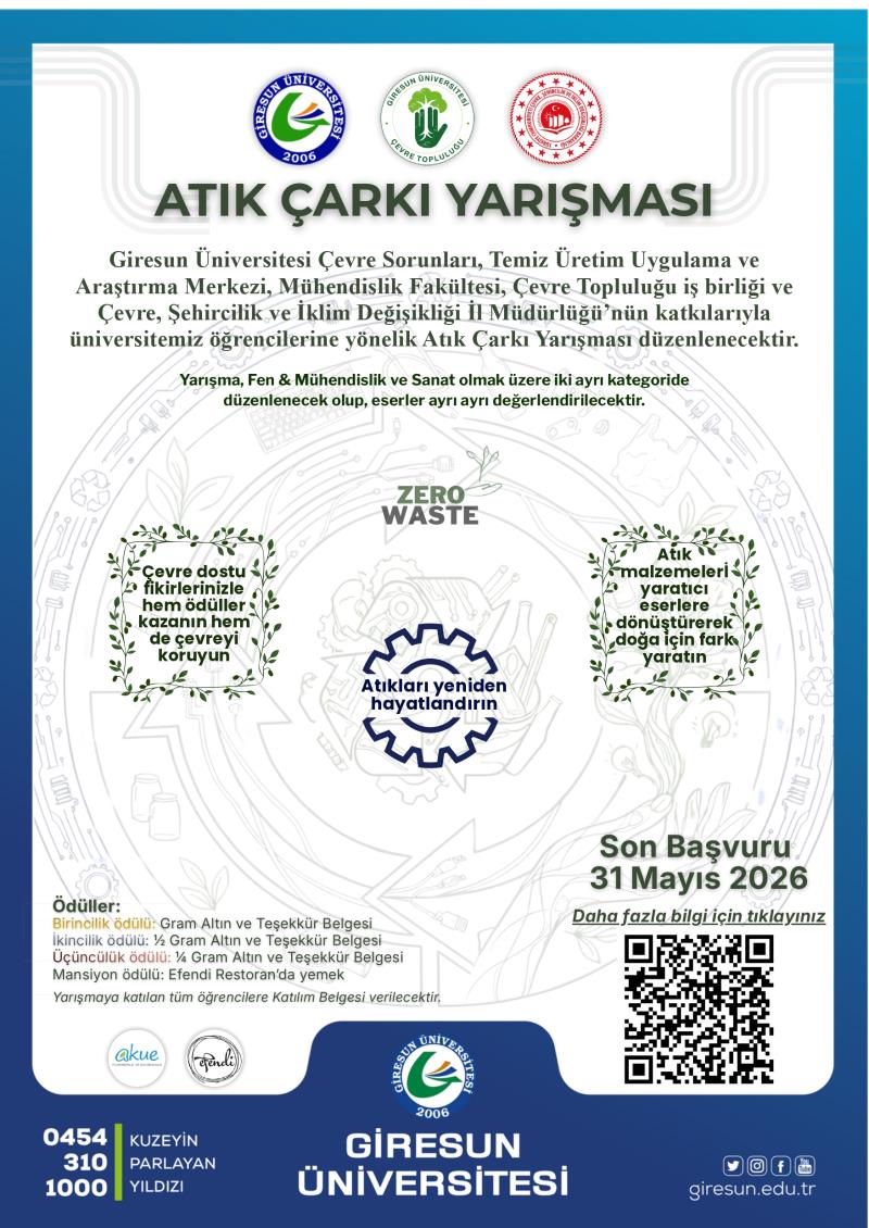 Atık Çarkı Yarışmasına, Giresun Üniversitesi ön lisans/lisans/yüksek lisans ve doktora seviyesindeki tüm öğrencilerimiz katılabilir.