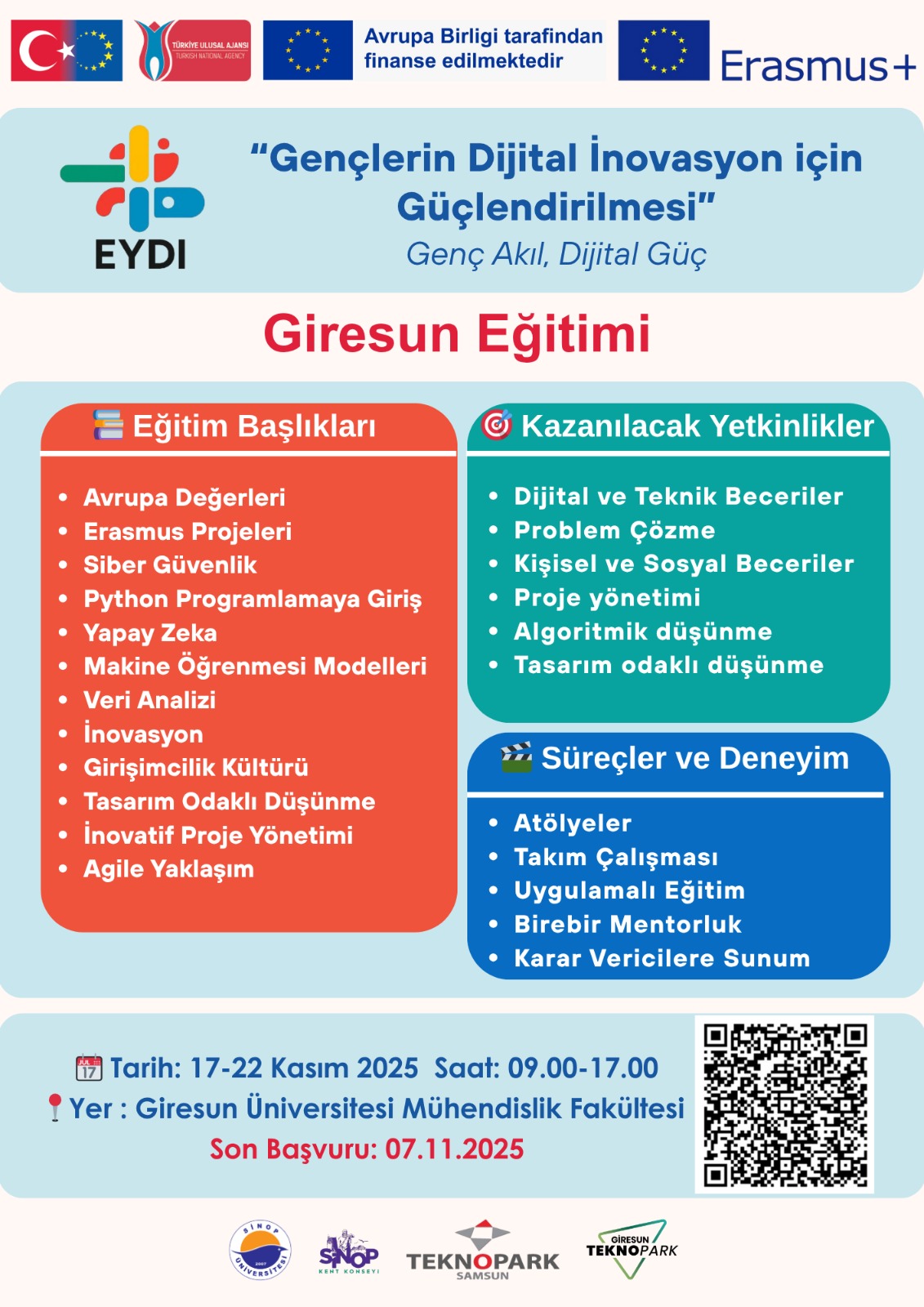 Eğitim 17-22 Kasım 2025 tarihleri arasında Giresun Üniversitesi Mühendislik Fakültesi'nde gerçekleşecektir. Detaylı bilgi başvuru kapandıktan sonra sizlere duyurulacaktır.
