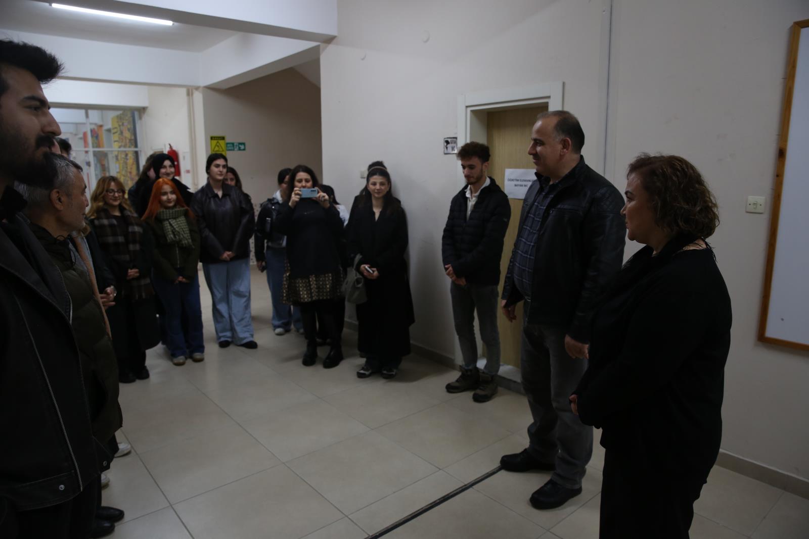 Sayın AKSU'nun ardından söz alan Doç. Dr. Elif Mamur YILMAZ, sergide yer alan gravür çalışmalarında hayvanların yalnızca betimlenen figürler olarak değil; insanla aynı dünyayı paylaşan özneler ve tanıklar olarak ele alındığını ifade etti. Gravür tekniğinin derin çizgileri ve katmanlı yapısının, doğanın sessiz tanıklığını ve hayvanların görünmez hikâyelerini görünür kıldığını söyleyen Sayın YILMAZ, çalışmalarının izleyiciyi hem estetik hem de etik bir karşılaşmaya davet ettiğini belirtti.