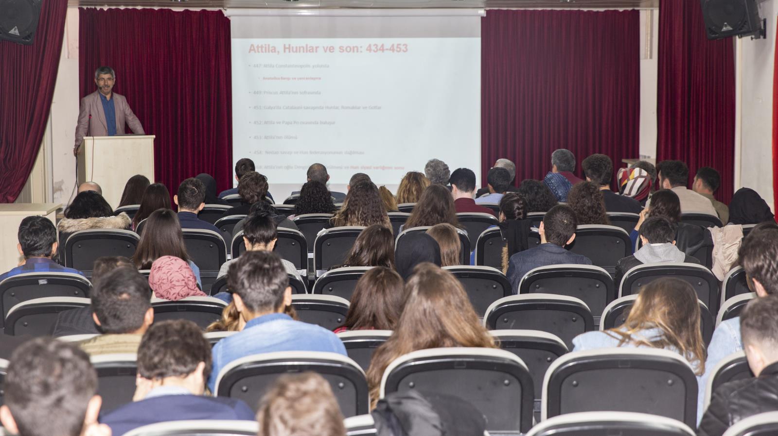 Etkinlikte kısa bir konuşma yapan Topluluk Akademik Danışmasını Doç. Dr. Mehmet Özmenli, topluluk olarak yaptıklarını çalışmalar hakkında bilgi verdi. Kendilerini kırmayarak programa katılan Prof. Dr. Turhan Kaçar'a teşekkür eden Özmenli’nin ardından başlayan konferansta, Avrupa Hunları ve Türk Tarihindeki yeri konuşuldu.