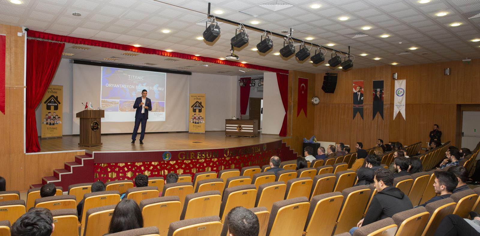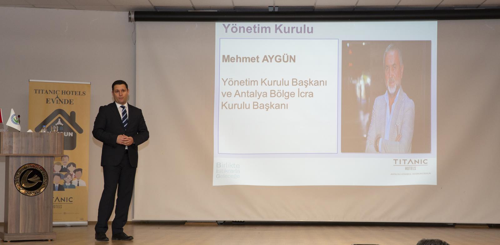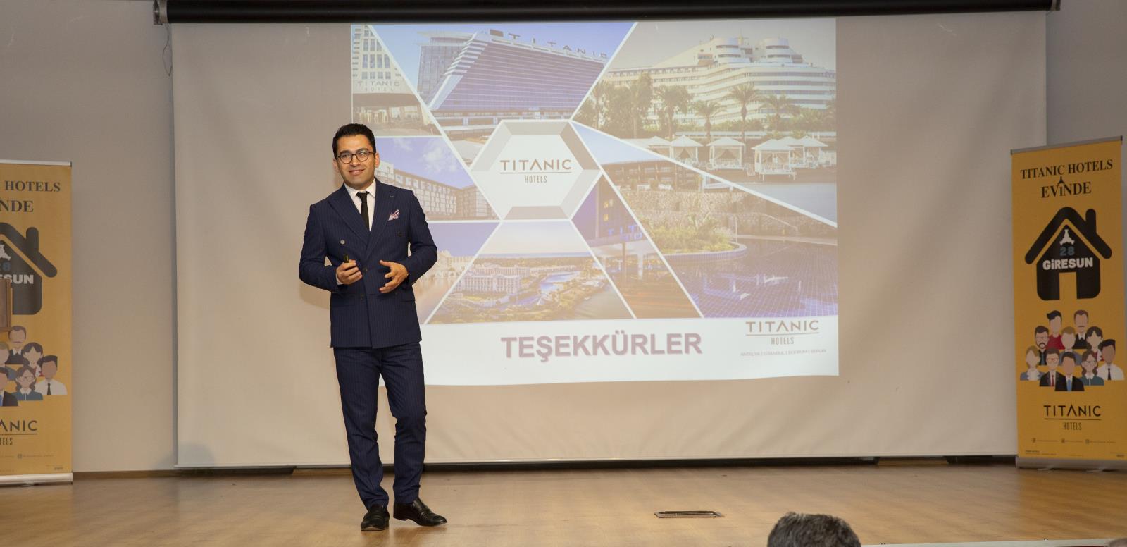 Titanic Otelleri olarak Giresun’un ve buradan mezun olacak, turizm alanında çalışacak öğrencilerin kendileri için büyük önem taşıdığını belirten Çağatay Erdoğan’ın ardından Antalya Bölge İnsan Kaynakları Müdürü Erkut Dalkıran söz aldı. Konuşmasında büyük otellerin yönetim modellerine değinen Dalkıran, bünyesinde yer aldıkları Titanic Otellerinin kuruluş ve gelişimine, öğrencilerin bu tarz işletmelere başvururken veya buralarda çalışırken dikkat etmeleri gereken hususlara değinerek konuşmasını noktaladı.