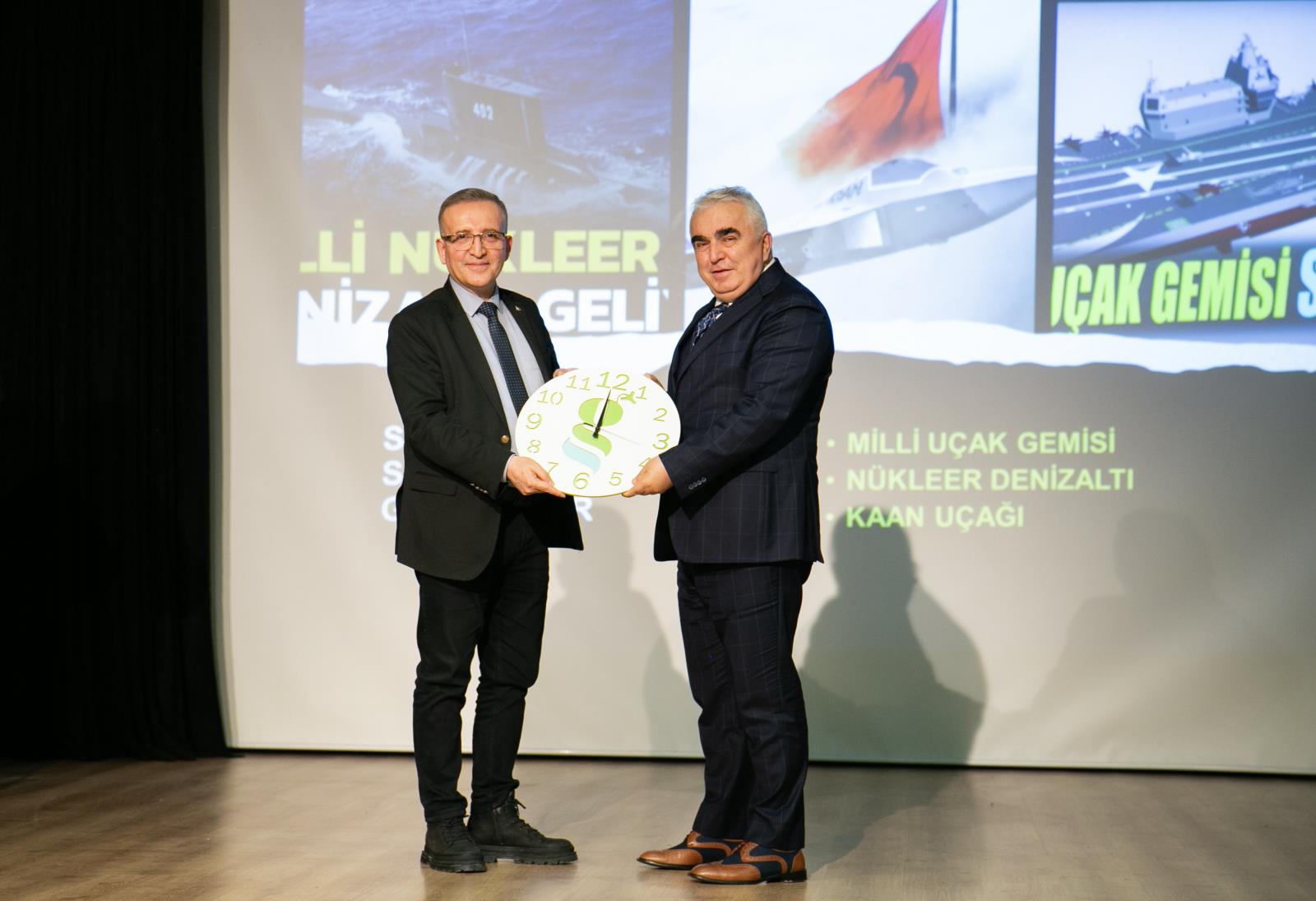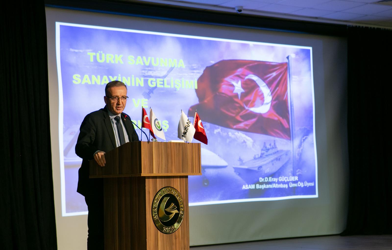 Giresun Vakfı Başkanı Bahattin Şener ve MÜSİAD Giresun Temsilcisi Cumhur Mellikoğlu ile birlikte her iki kurumun yönetim kurulu üyelerinin de izlediği konferansta Dr. Eray Güçlüer, Türk savunma sanayisinin son yıllarda gösterdiği olağanüstü gelişmeler hakkında önemli bilgiler sundu.