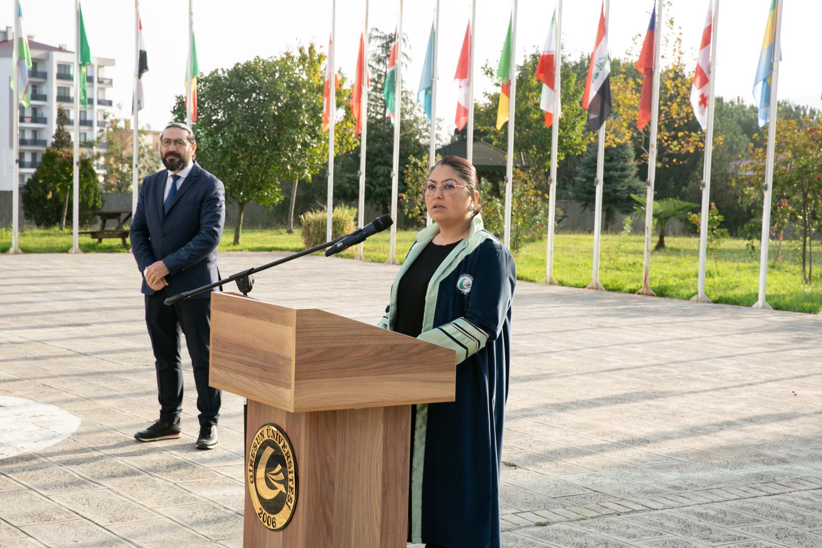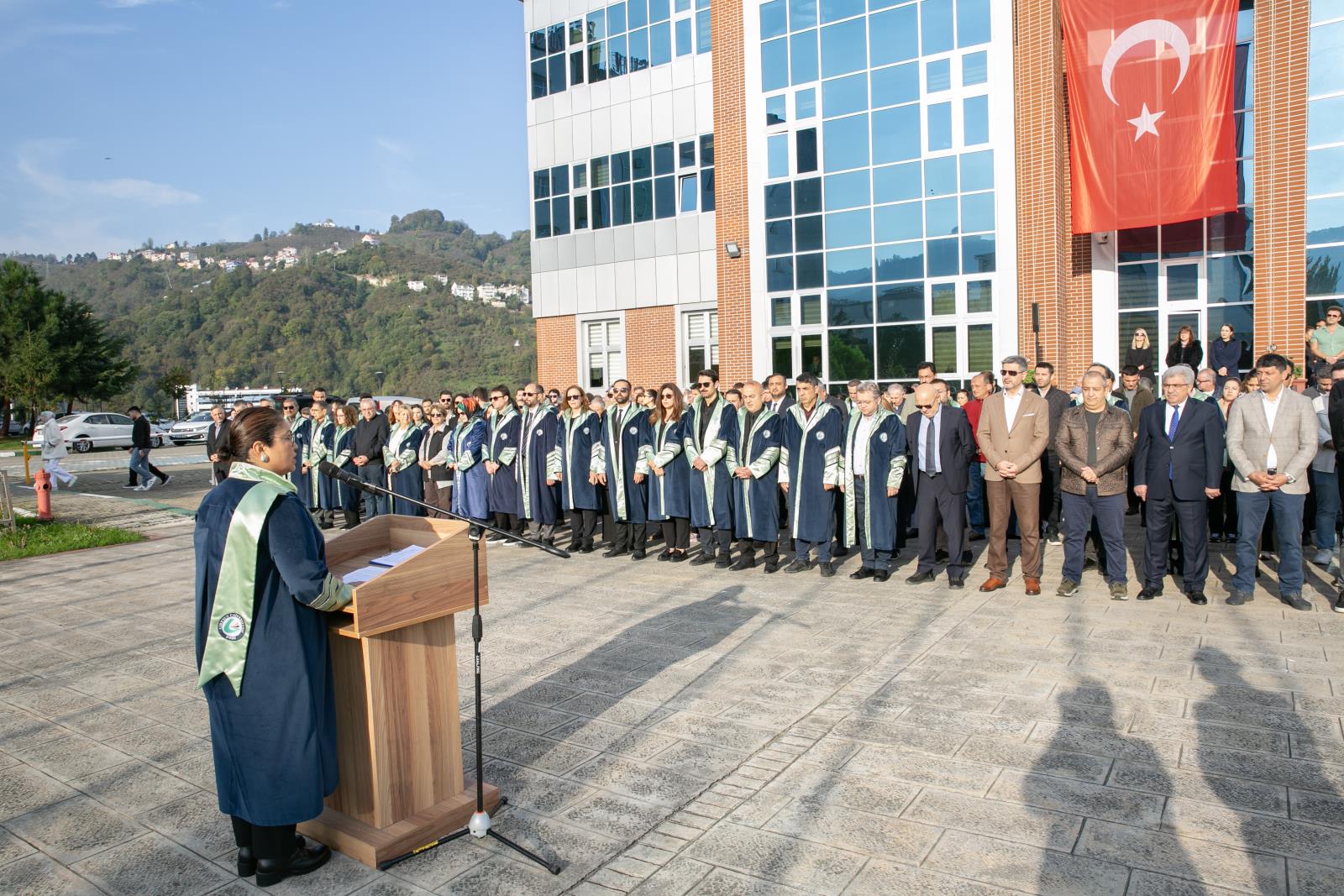 Tören, Giresun Üniversitesi Güre Yerleşkesinde bulunan Atatürk Anıtı’na çelenk sunumuyla başladı. Atatürk Anıtı’na çelengi Rektör Yardımcımız Prof. Dr. Hüseyin Şahin sundu. Saygı duruşu ve İstiklal Marşı’nın okunmasının ardından törende günün anlam ve önemine ilişkin konuşmayı Sağlık Bilimleri Fakültesi öğretim üyesi Doç. Dr. Eda Şahin yaptı.
