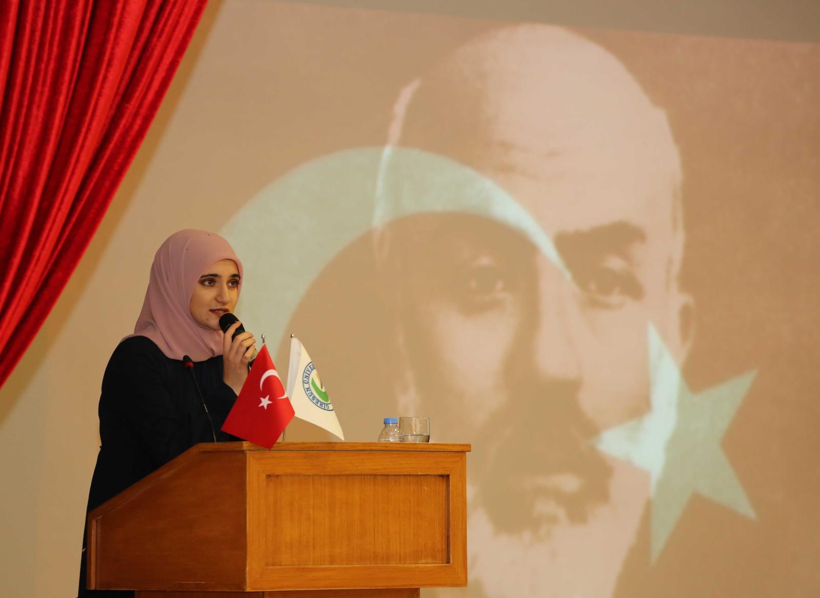 İlk olarak Mustafa Kemal Atatürk’ün M. Akif Ersoy’a dair düşüncelerine değinen Dr. Öğr. Üyesi Dursun Şahin, onun İstiklal Marşı’nın özellikle; “Hakkıdır, hür yaşamış bayrağımın hürriyet; Hakkıdır, Hakk’a tapan milletimin istiklal !” dizelerini beğendiğini ve bu dizelerde ifade edilmek istenen Hürriyet ve İstiklal aşkının millet tarafından asla kaybedilmemesi gerekliliğine vurgu yaptığını söyledi.
