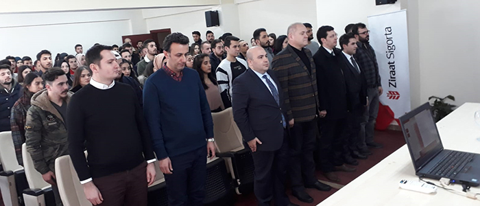Açılış konuşmasının ardından davetli konuşmacı Ziraat Sigorta A.Ş. ve Ziraat Emeklilik A.Ş. Karadeniz Bölge Yöneticisi Murat Selçuk Arslan konuşmasını yapmak üzere kürsüye davet edildi. Konuşmasında genel olarak uluslararası ticaret, temel sigortacılık ve nakliyat sigortası kavramlarına değinen Arslan, sigortacılık sektörüne ve bu sektörün önemine ilişkin açıklamalarda bulundu. Daha sonra uluslararası şirketlerin temel risk alanları ve bu risk tanımlarının nasıl etkin ve verimli yönetilmesi gerektiğine değinen Arslan, stratejik açılımların paylaşılmasının öneminden bahsederek sözlerini sonlandırdı.