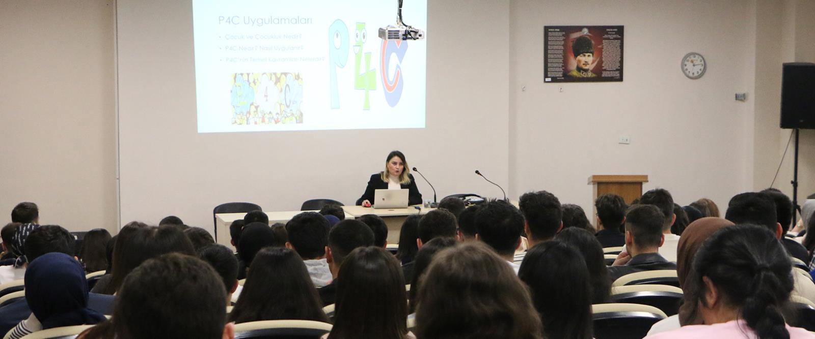 Daha sonra söz alan Dr. Öğr. Üyesi Fatma Hürrem SÜNNEY, Çocuklar ve Topluluklar için Felsefe konusunun temel ilkeleri ve tekniklerini anlattı. İnteraktif bir sunum gerçekleştiren Fatma Hürrem SÜNNEY’ program sonunda teşekkür belgesi takdim edildi.