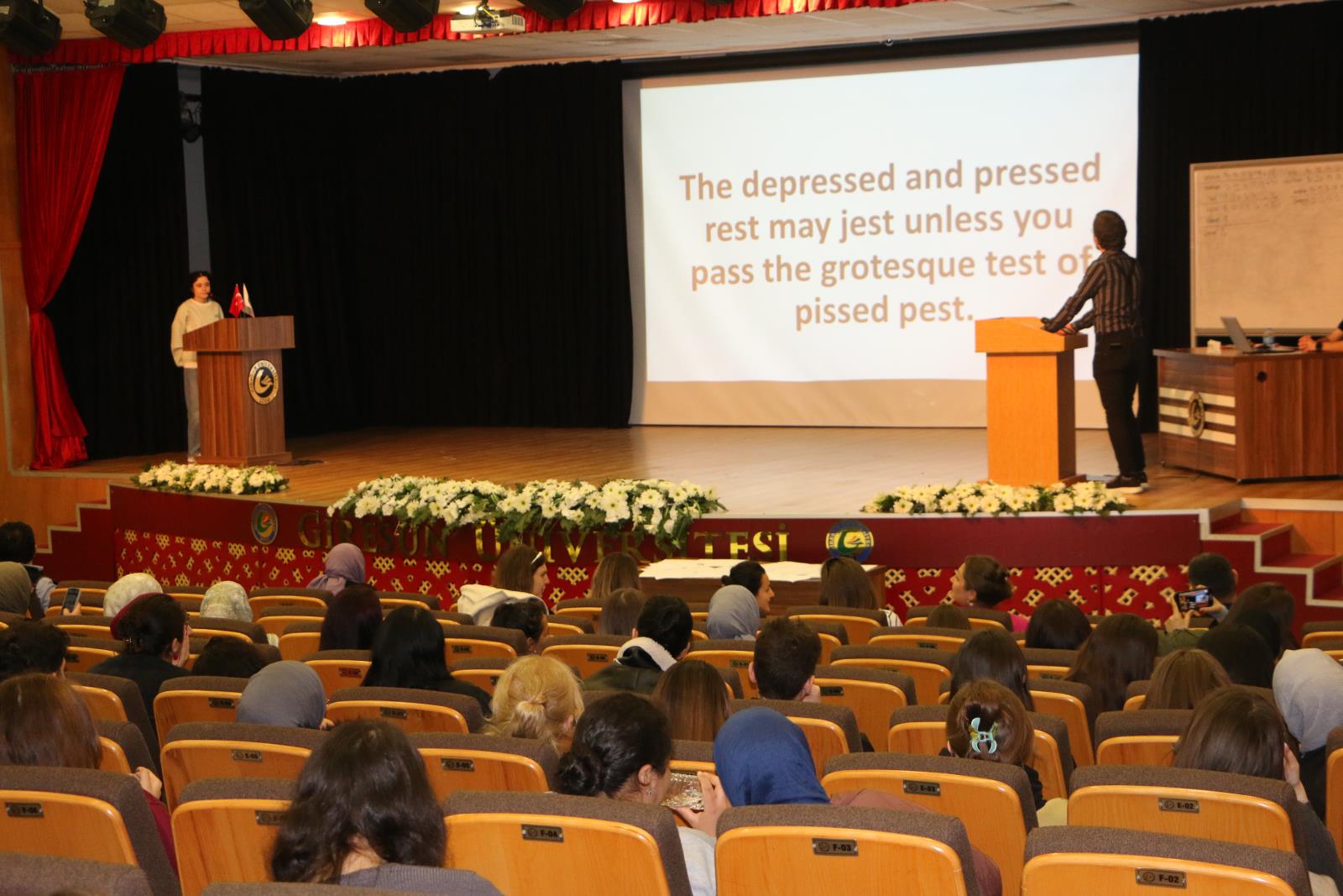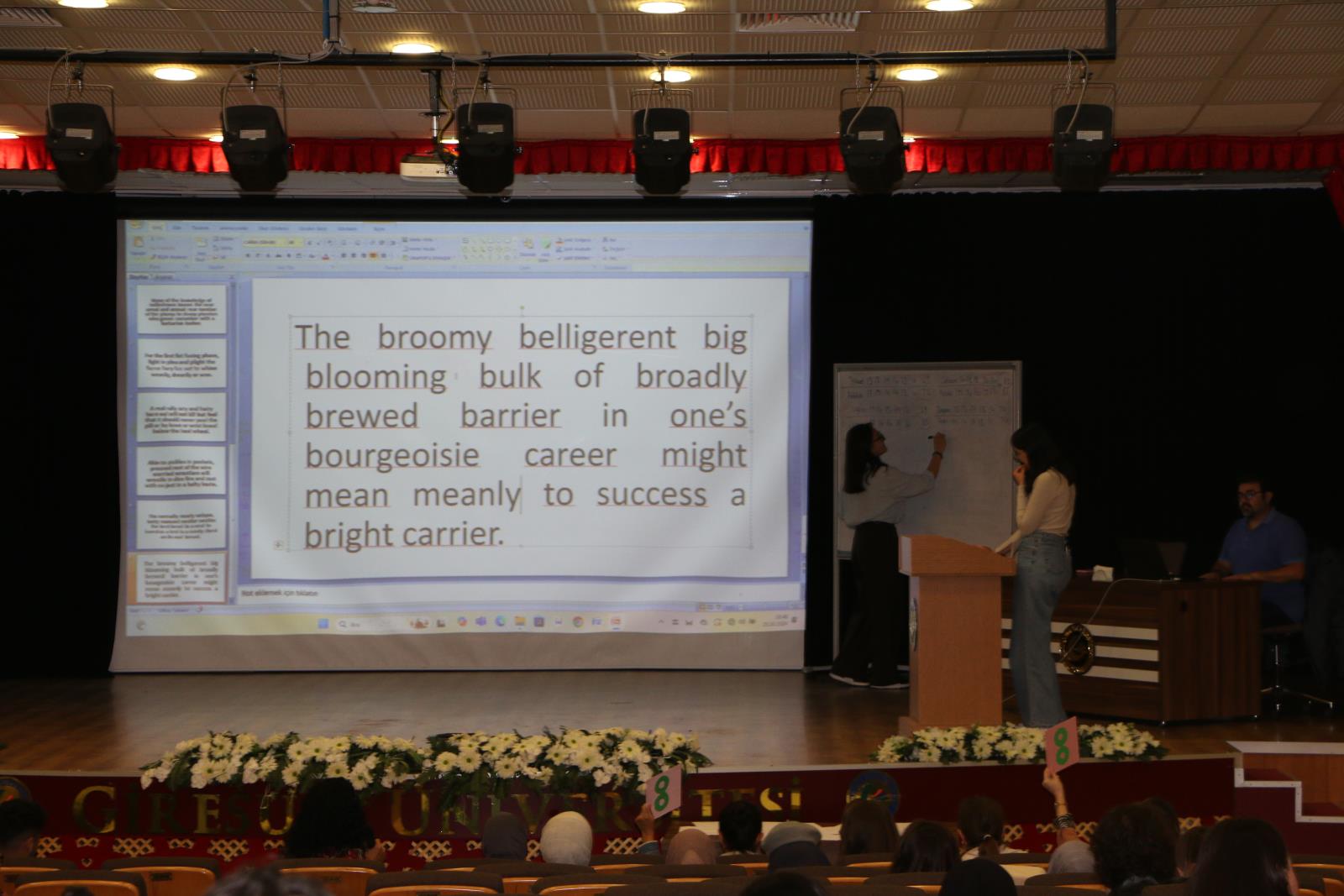 Programda konuşan Edebiyat Fakültesi Dekanı Prof. Dr. Beyhan KESİK, düzenlenen etkinlikte emeği geçenlere teşekkür ederek, bu ve benzeri organizasyonları daima destekleyeceklerini ifade etti. Sayın KESİN’in ardından kürsüye çıkan Rektör Yardımcısı Prof. Dr. Hüseyin ŞAHİN de konuşmasına etkinliği düzenleyen akademisyenler ile salonda bulunan öğrencilere teşekkür ederek başladı. Etkinliğin, bir yarışmadan ziyade hem izleyiciler hem katılımcılar açısından keyifli bir öğrenme ortamı olduğunu dile getiren Sayın ŞAHİN’in ardından başlayan yarışmada İngiliz Dili ve Edebiyatı, Yabancı Diller Eğitimi ve Yabancı Diller Yüksekokulu Hazırlık sınıfı öğrencileri kendilerine verilen İngilizce cümleleri en doğru şekilde telaffuz ederek okumaya çalışırken, öğretim elemanlarından oluşan jüri, öğrencilerin performanslarını değerlendirip puanlama yaptı.