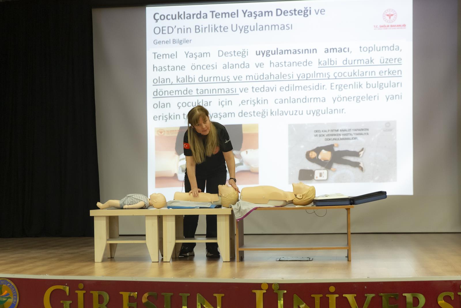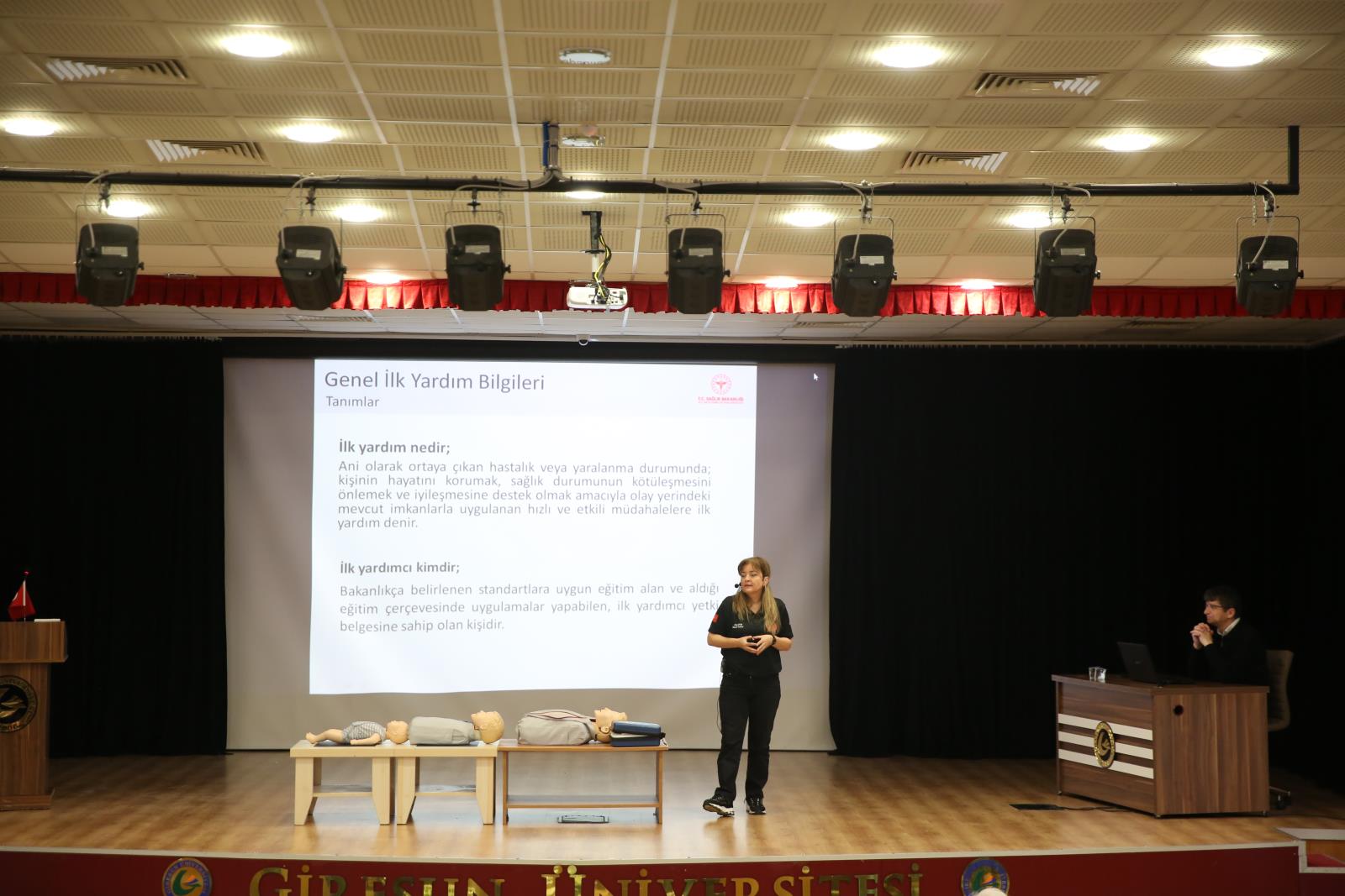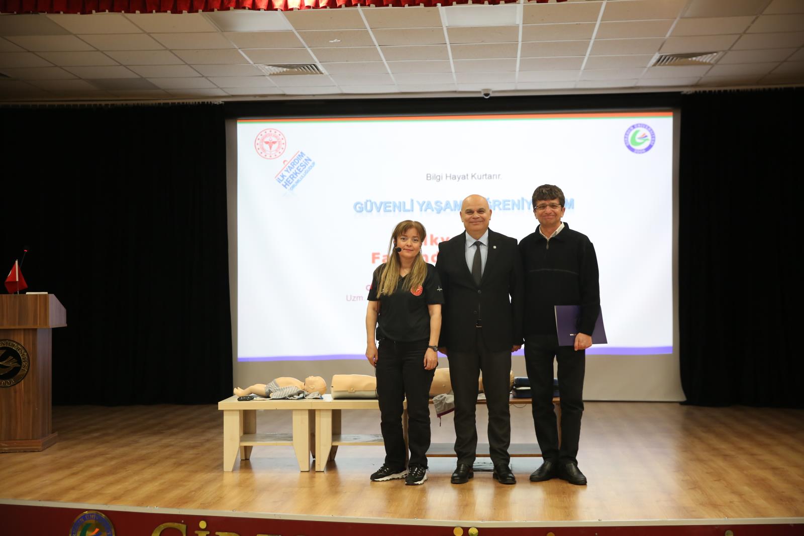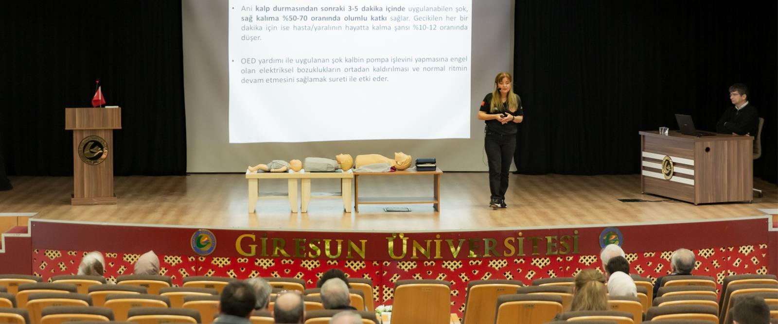 Üniversitemizin Sivil Savunma Birimi tarafından organize edilen etkinlik, Giresun İl Sağlık Müdürlüğü Uzman İlk Yardım Eğitmeni Hemşire Gülay BİLGE’nin sunumuyla yapıldı. Programın açılışında konuşan GRÜ Sivil Savunma Uzmanı Ertuğrul YALÇIN, insan hayatının her an beklenmedik olaylarla karşı karşıya kalabileceğini belirterek, afet ve acil durumlarda, hastalık ve yaralanmalarda tıbbi yardım ulaşıncaya kadar geçen “altın dakikalar”da yapılan ilk yardımın hayati önem taşıdığını vurguladı. Yalçın, acil durumlarda her saniyenin değerli olduğuna dikkat çekti.