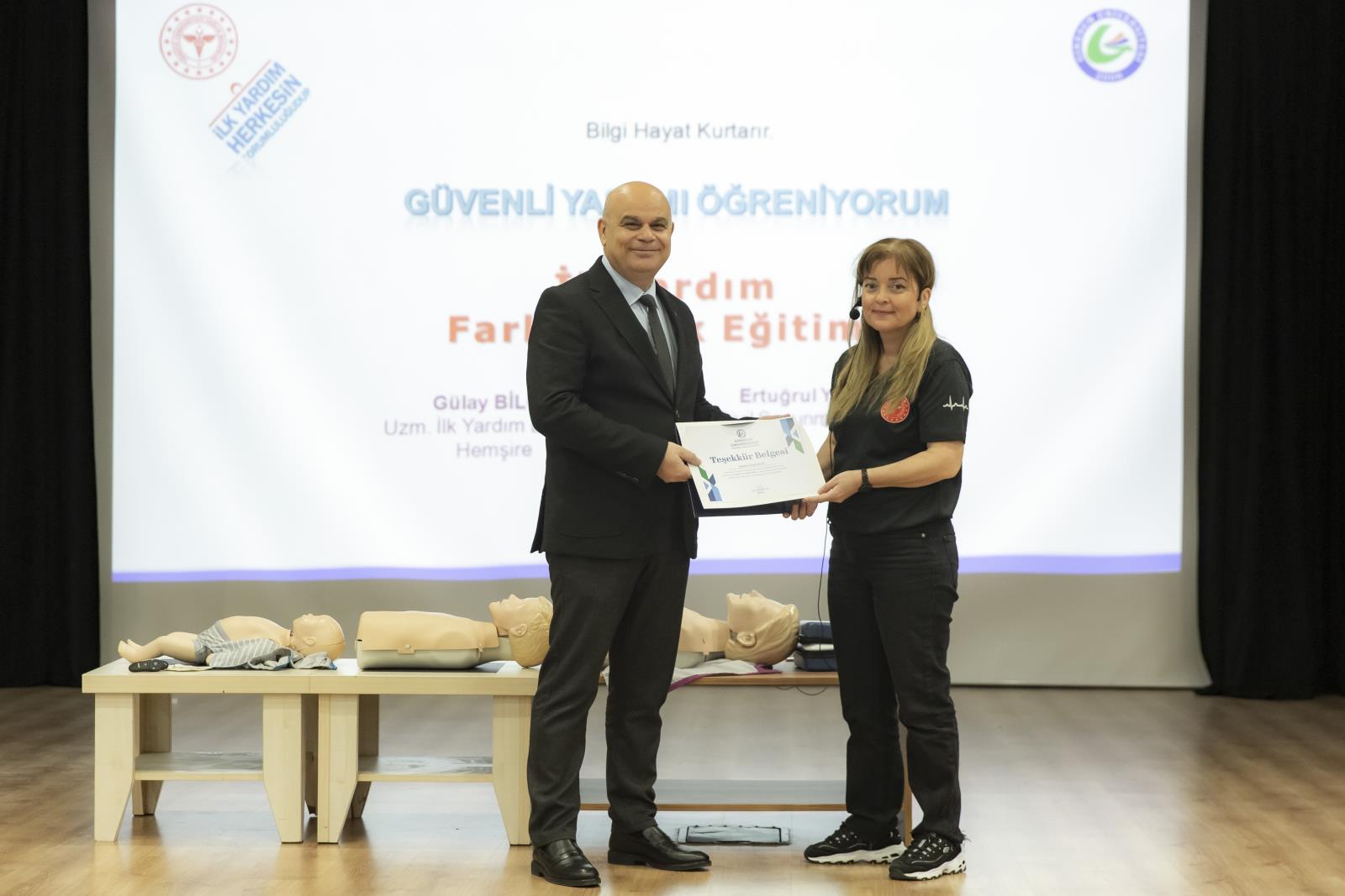 Programın ilk bölümünde katılımcılara; genel ilk yardım bilgileri, ilkyardımcı kimliği, olay yeri güvenliği ve değerlendirmesi, hasta ve yaralıların durumunun belirlenmesi, 112 Acil ile doğru iletişim, temel yaşam desteği ve Otomatik Eksternal Defibrilatör (OED) kullanımına ilişkin teorik ve uygulamalı bilgiler aktarıldı. Ayrıca yetişkin, çocuk ve bebeklerde acil durumlarda uygulanacak yöntemler görsel materyaller eşliğinde anlatıldı.