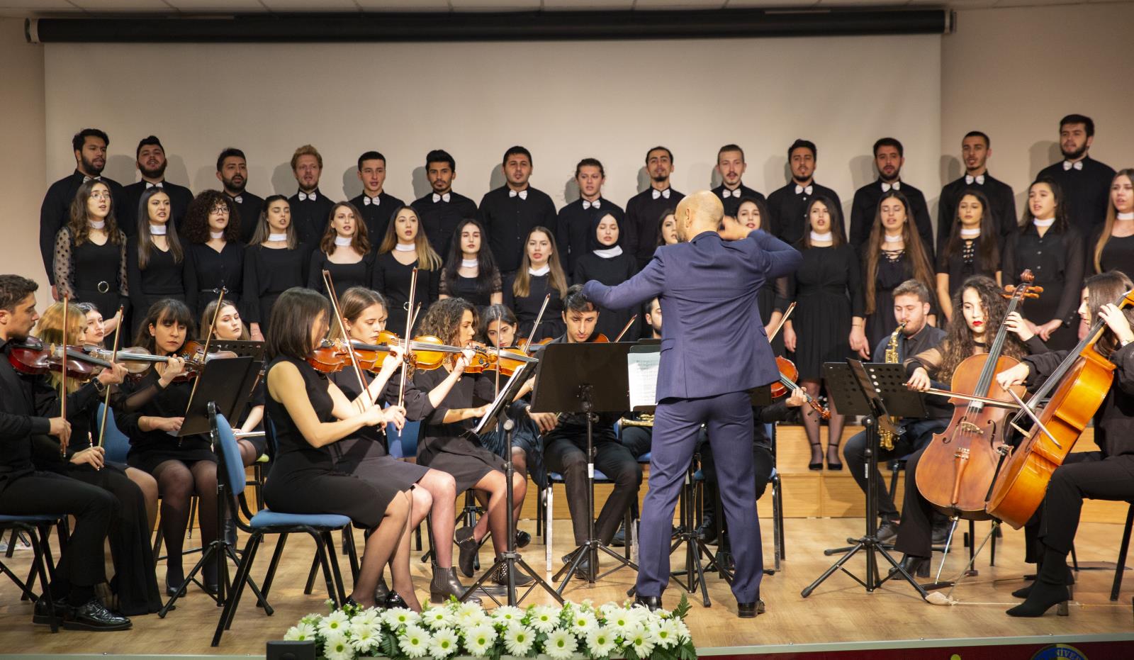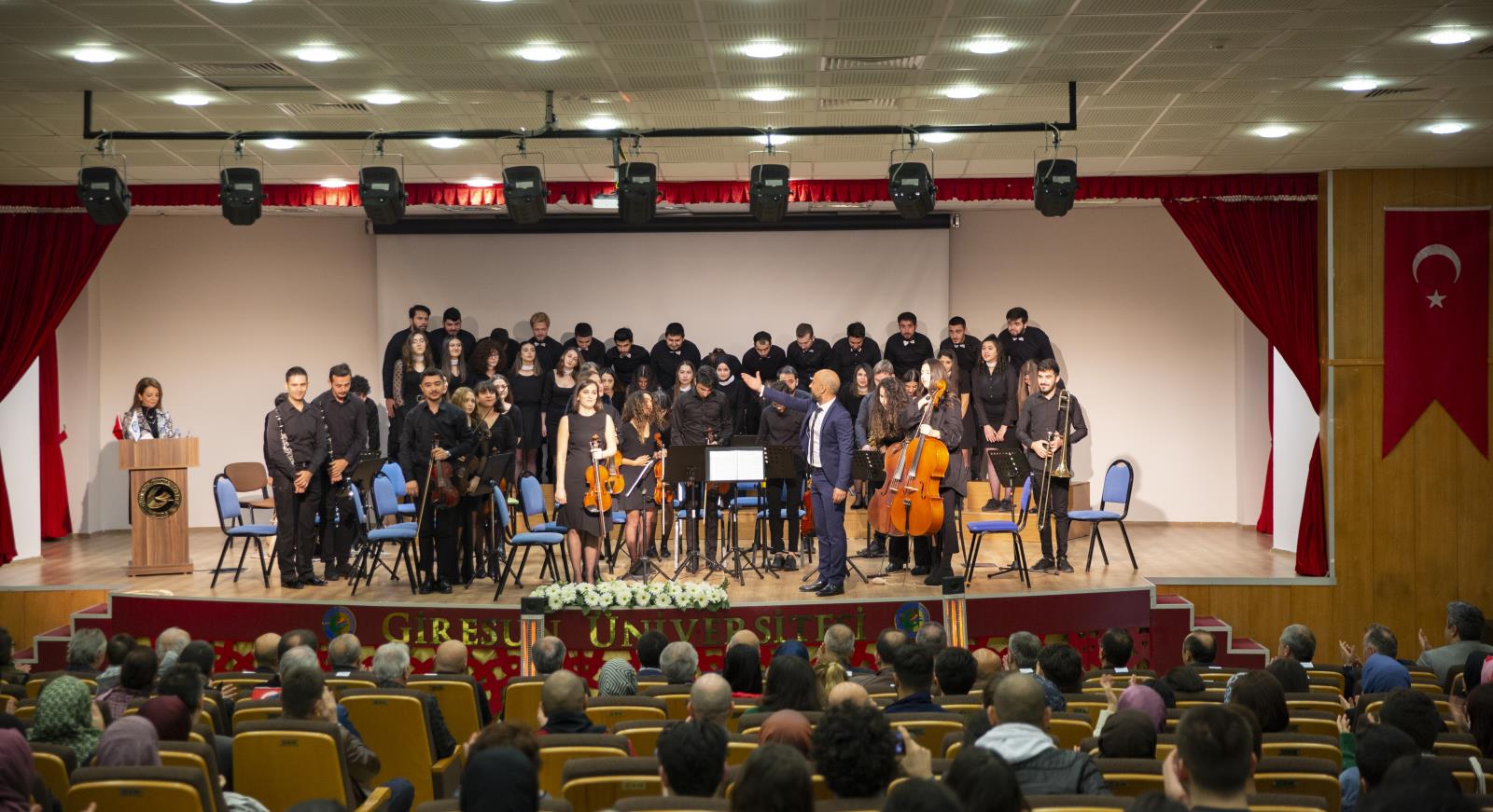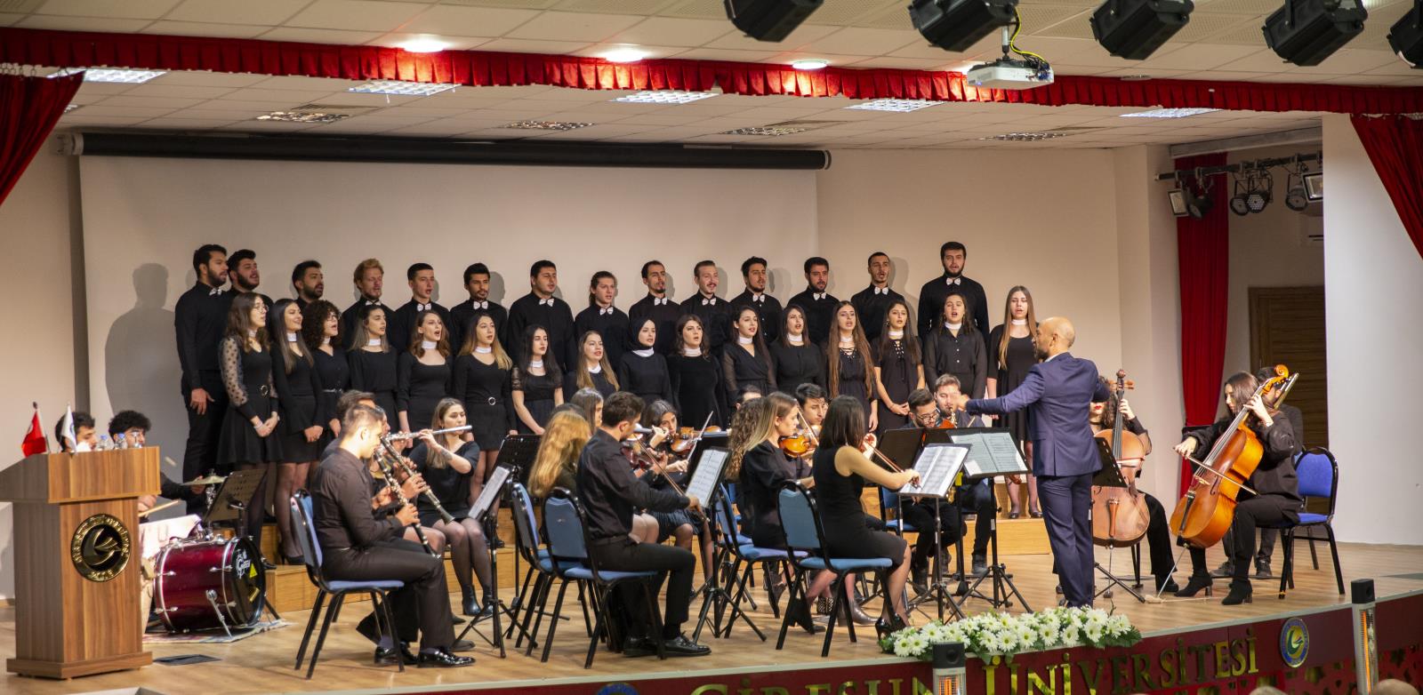 Saygı duruşu ve akabinde Eğitim Fakültesi Müzik Eğitimi Anabilim Dalı akademisyenlerinden Doç. Dr. İzzet Yücetoker’in şefliğinde öğrenci orkestrası ve korosunun İstiklal Marşı’mızı seslendirmesiyle başlayan program, koronun icra ettiği birbirinden güzel eserlerle devam etti.