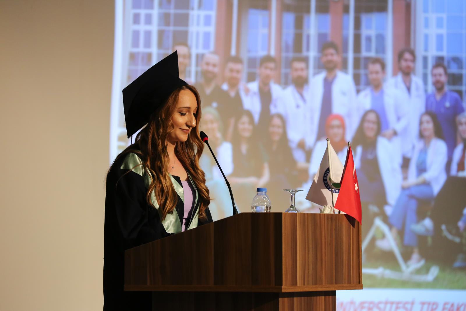 Programda, mezun öğrenciler adına konuşan fakülte birincisi Pelin Kamuran Duran’ın ardından, Tıp Fakültesi Dekanı Prof. Dr. Canan Çelik bir teşekkür konuşması yaptı.