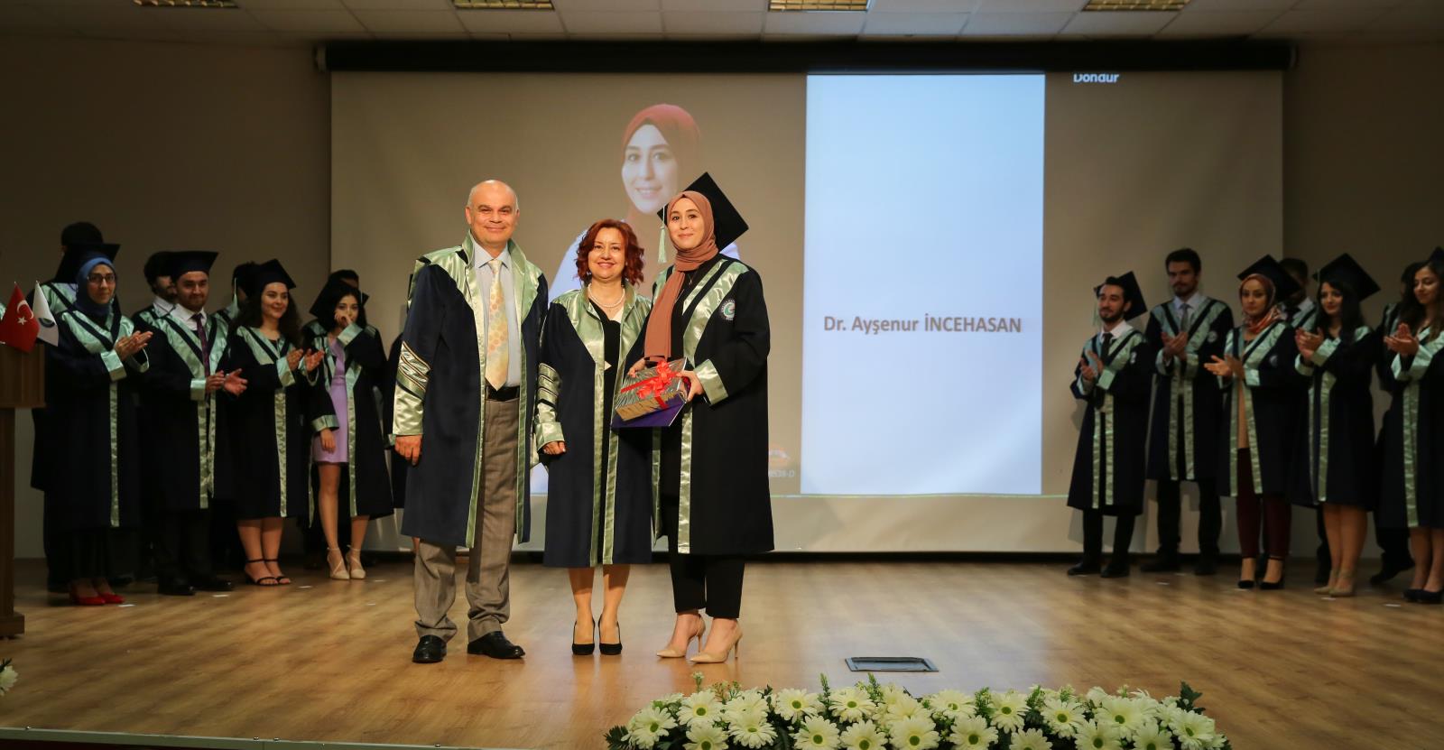 Fakülte birincisi Pelin Kamuran Duran'ın Prof. Dr. Canan Çelik eşliğinde mezuniyet kütüğüne plaket çakmasının ardından, mezun öğrenciler kep atma töreninde arkadaşları ve aileleriyle mezuniyet coşkusunu yaşadılar.