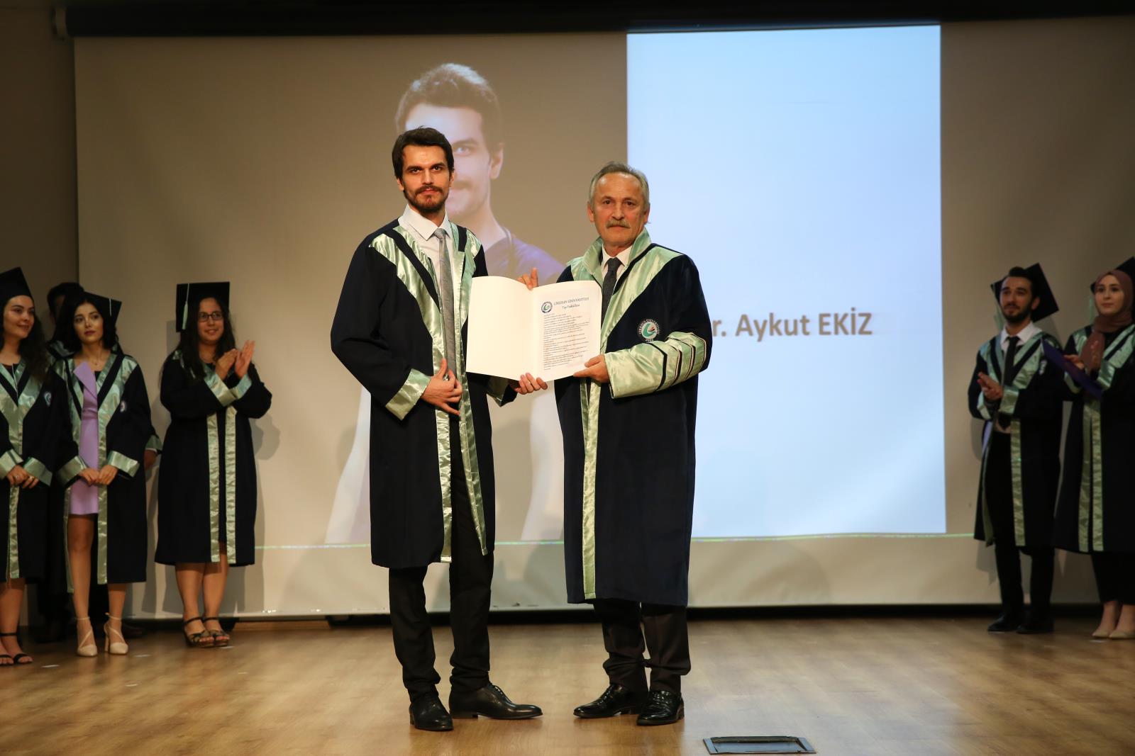 Tıp Fakültesi mezunlarının hazırladığı ve altı yıllık eğitim hayatları boyunca biriktirdikleri anıları salondaki misafirlerle paylaştıkları slayt gösterinin ardından, diploma töreni gerçekleşti.