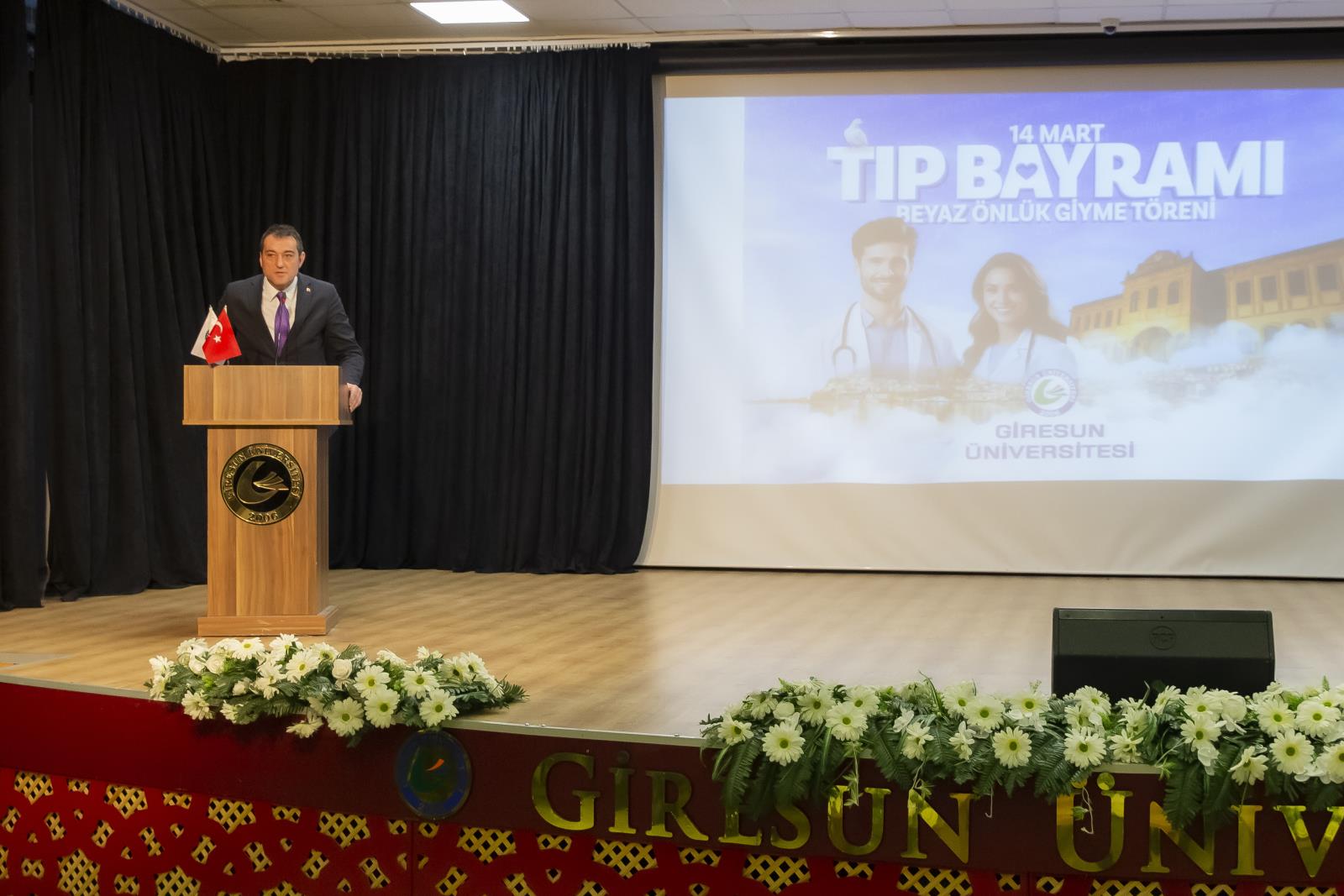 Programın açış konuşmasını yapan Tıp Fakültesi Dekanı Prof. Dr. Erdal AĞAR, salonunu dolduran sağlıkçıların “14 Mart Tıp Bayramı”nı kutlayarak sözlerine başladı. GRÜ Tıp Fakültesi hakkında genel bilgiler veren Sayın AĞAR sözlerini şu şekilde sürdürdü: “…14 Mart 1827’de İstanbul’da modern tıp eğitiminin temelleri atıldığında, bu topraklarda yalnızca bir mesleğin disiplini değil, aynı zamanda bir ülkü, vicdan, sorumluluk sahibi olmanın da temelleri atıldı. O günden günümüze kadar, özellikle de milli mücadele yıllarında tıbbiyeliler tüm dünyaya hekimliğin yalnızca bir meslek olmadığını en güzel örnekleriyle göstermişlerdir. Bugün sizler, geçmişten gelen bu değerli mirasın sembolü olan beyaz önlüğü giyerek mirası geleceğe taşıma yükümlülüğünü almış olacaksınız. … Sevgili gençler, tüm dünyada yaşanan ilkesizlik, haysiyetsizlik, gaddarlık ve insanlıktan nasibini almamışlık haline inat bizler daha çok ilkeli, daha fazla haysiyetli, daha merhametli, daha fazla insan olmak zorundayız. Bizler İnsanlığın umudu olmak zorundayız. Sizler mesleğinizi icra ederken bunu tüm insanlığa gösterebilirsiniz. Biliniz ki insanlığın yüksek değerleri olmadan ortaya koyacağınız meslek uygulamalarınızın etkisi oldukça sınırlı olacaktır… Zorlu eğitim ve öğretim hayatınızda başarılar dilerim. 14 Mart tıp bayramınızı tekrar tebrik eder, saygılar sunarım.”
