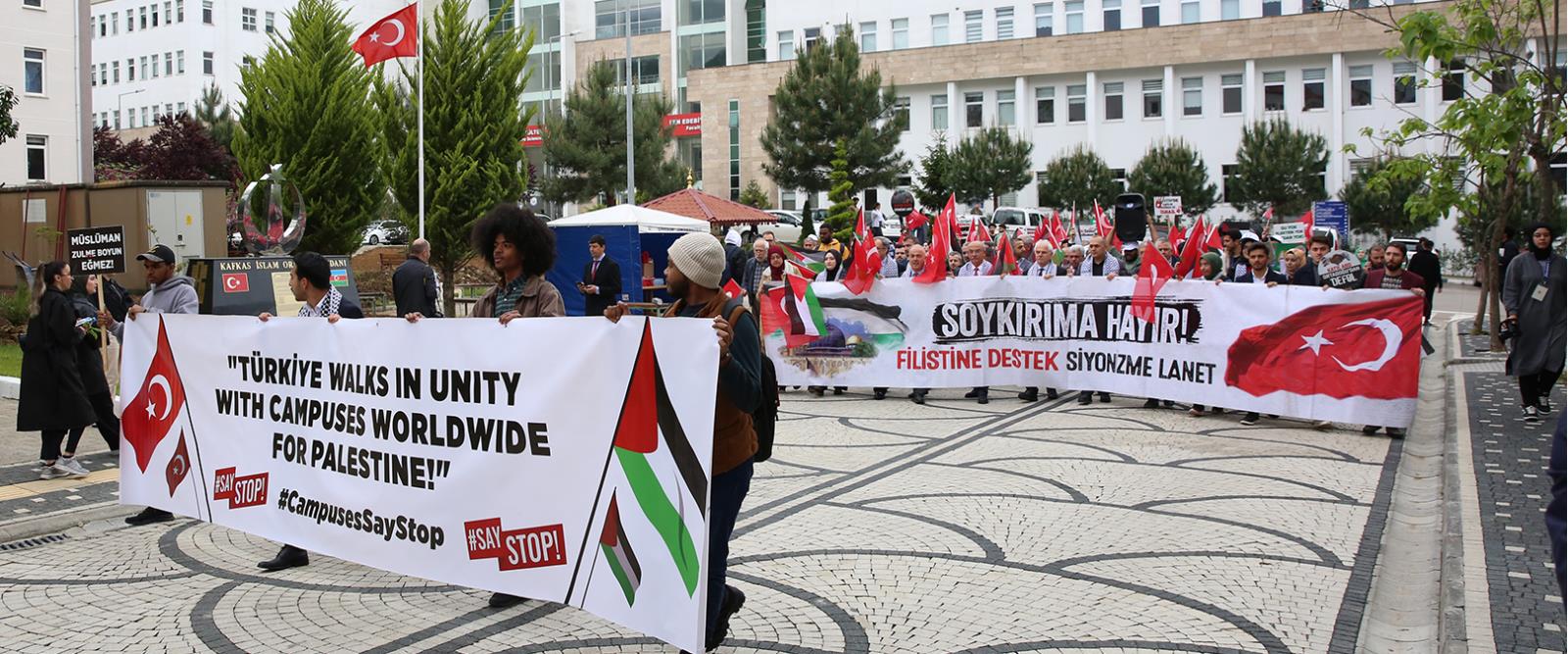 Rektörümüz Prof. Dr. Yılmaz CAN, Giresun Milletvekili Prof. Dr. Nazım ELMAS, Üniversitemizin akademik ve idari personeli ile öğrencilerin katılım sağladığı yürüyüş sonrasında topluluk akademik danışmanı Öğr.Gör. Recep YAĞCI bir basın açıklaması yaptı. Filistin'de ve Doğu Türkistan'da yaşananların kınandığı konuşmanın akabinde katılımcılar, her iki bölgede yaşananaların gözler önüne serildiği fotoğraf sergisini gezdiler.