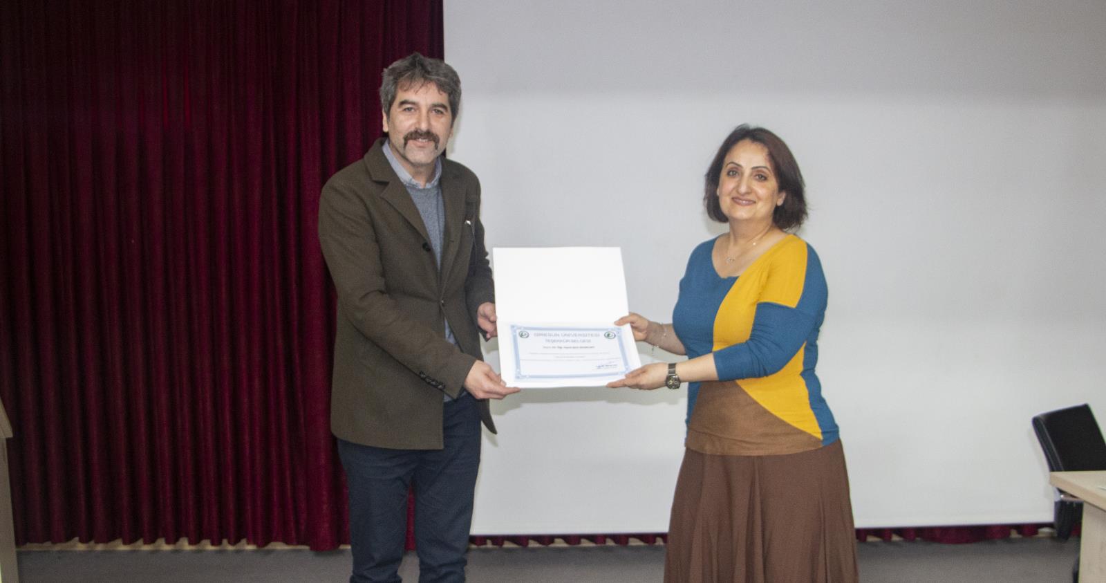 Soru-cevap bölümünün ardından, Dr. Öğr. Üyesi Şerif Ali Değirmençay tarafından konuşmacıya teşekkür belgesi takdim edilmesiyle konferans son buldu.
