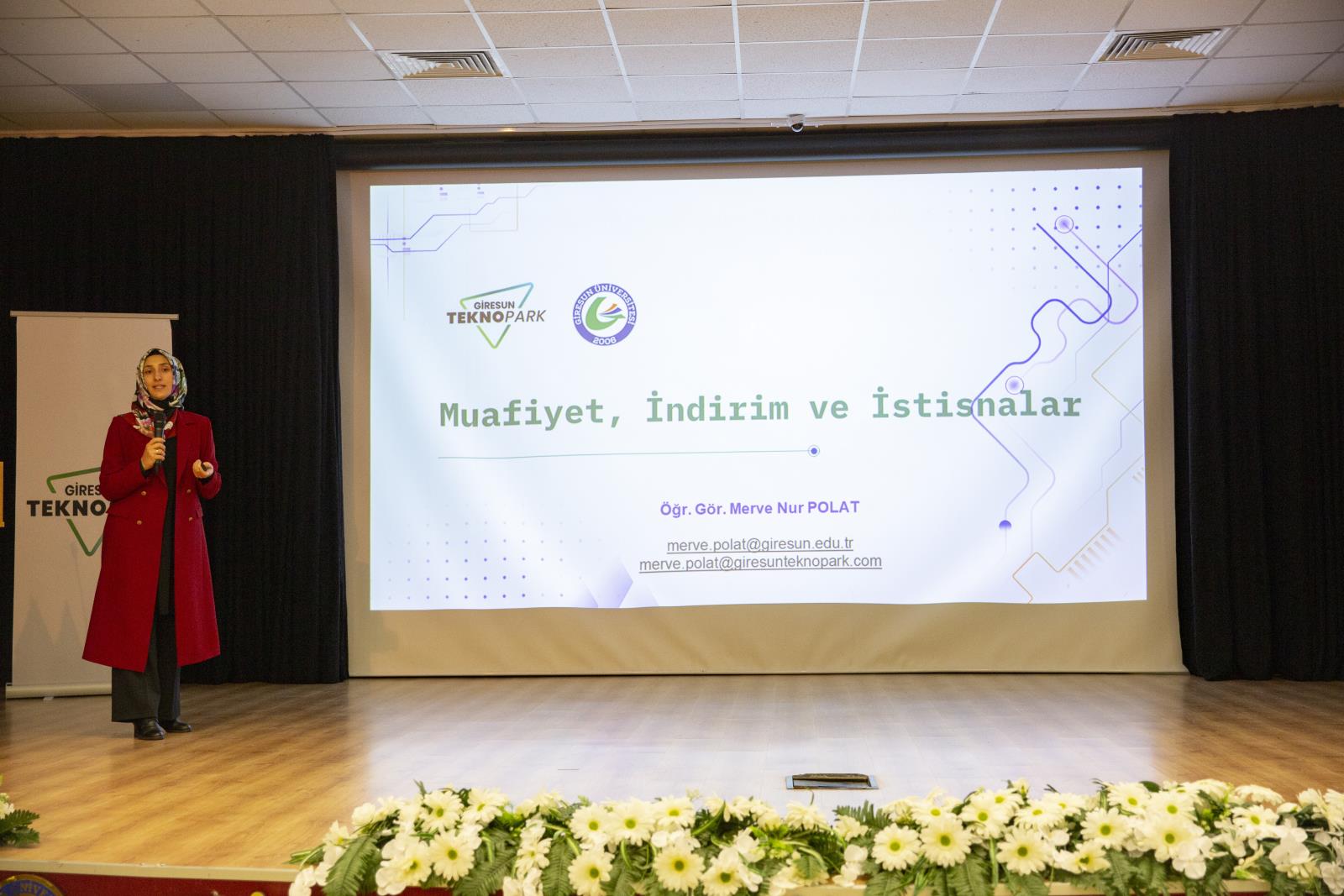 Giresun Teknopark Genel Müdürü Dr. Öğr. Üyesi Muhammet Anıl KAYA'nın “Kuruluşundan Bugüne Giresun Teknopark” temalı sunumu ile devam eden programda Öğr. Gör. Dr. Şafak Esra ASLAN da “Giresun Teknopark Proje Başvuru Süreci”, Öğr. Gör. Merve Nur POLAT da “Teknopark Muafiyetleri” başlıklı birer sunum gerçekleştirdiler.