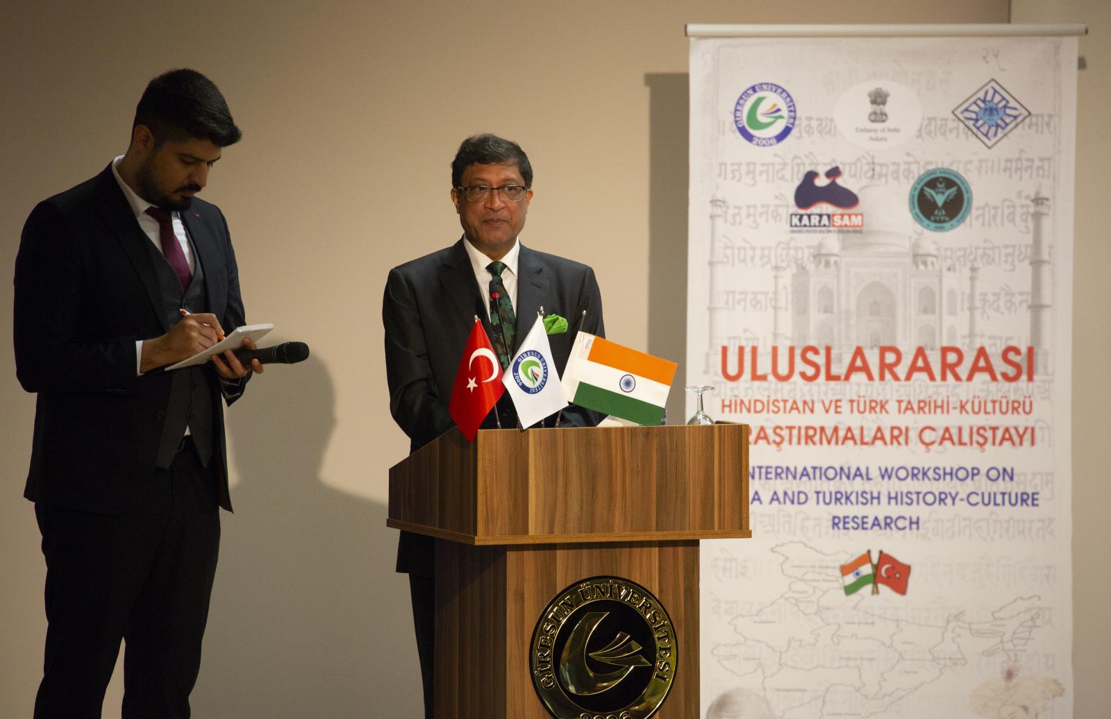 Rektörümüzün konuşmasının ardından Hindistan Büyükelçisi Sanjaj Bhattacharyva konuşmasını yapmak üzere kürsüye çıktı. Bhattacharyva, Giresun’da olmaktan mutlu olduğunu ve çalıştayın düzenlenmesinde emeği geçenlere teşekkürlerini ileterek konuşmasına başladı. Türkiye ve Hindistan arasındaki tarihin uzun bir geçmişe dayandığını belirten Büyükelçi, henüz iki ülke arasındaki tarihi ele alan yazılı bir kaynağın olmadığına değindi. Konuşmasında, son yıllarda iki ülke arasında birbirini anlamaya yönelik çalışmalar yürütüldüğünü ve “Uluslararası Hindistan ve Türk Tarihi Kültürü Araştırmaları Çalıştayı”nında iki ülke arasındaki yazılı kaynaklara önemli derecede katkılar sunacağını belirterek sözlerini sonlandırdı.