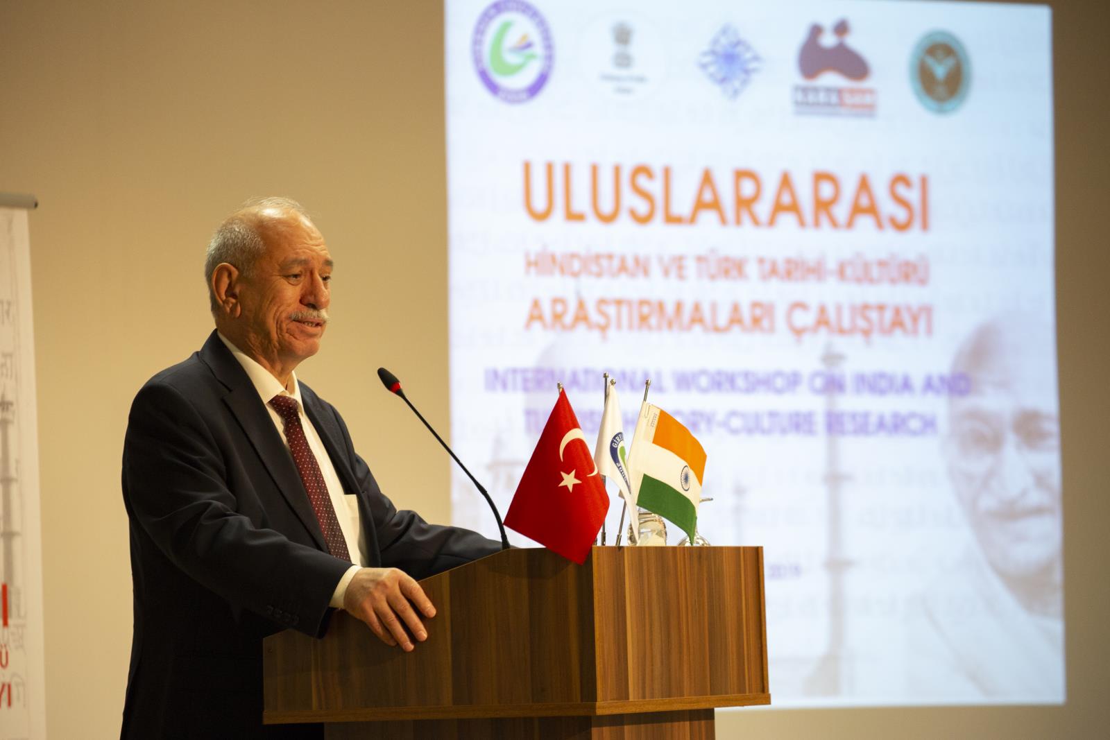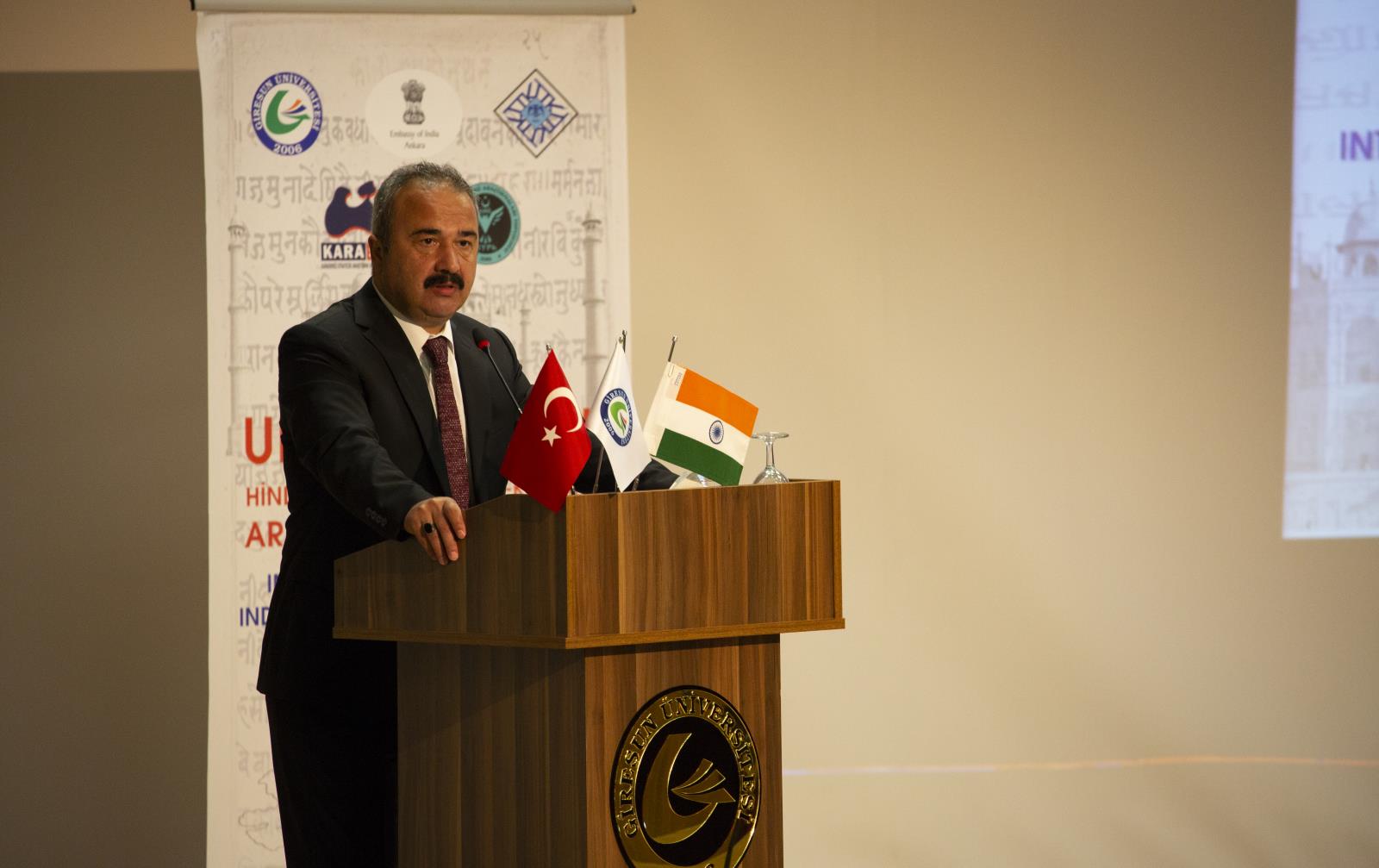 Konuşmanın ardından Rektörümüz Prof. Dr. Cevdet Coşkun kürsüdeki yerini aldı. Hint dinlerine, Hint bilimine, mistisizmine ve felsefelerine ilgi duyduğunu ve böyle bir etkinliğin üniversitemizde yapılmasından büyük mutluluk duyduğumu ifade eden Rektörümüz, şunları kaydetti: “Türkiye ve Hindistan aynı kaderi yaşayan ve aynı sonda buluşan iki ülkedir. Türkiye Cumhuriyetinin 20.asrın başlarında verdiği bağımsızlık mücadelesi sonrası devletler sahnesinde yer alması, tarihin oldukça önemli gelişmelerinden biridir. Yine Hindistan’ın ise İkinci Dünya Savaşı’nı takiben varlığını ortaya koyması ve bağımsız olarak devletler sahnesine çıkması da Asya kıtasının tarihsel dönüşümü bağlamında kayda değer hadiselerindendir. Burada şunu belirtmek gerekir ki milli mücadele dönemimizde bize, dünya çapında maddi-manevi anlamda en büyük katkıyı dönemin Hindistan’ı sağlamıştır. Bundan dolayı Hindistan halkına bir kez daha şükranlarımızı sunuyoruz. Konum itibariyle Türkiye Asya kıtasının Batı; Hindistan ise Güney kapısı olarak doğu ve batı dünyaları arasında birer geçiş mevkileridir. Tarihin her döneminde birbirlerini yakından izlediğinden kuşkumuz olmayan bu iki güçlü kardeş ülke dokudukları ortak bağla yakın ilişkilerini geleceğe de taşıyacaklardır. Etkinliğin başarılı geçmesini temenni ediyor, katılımınız için hepinize şükranlarımı sunuyorum” dedi.