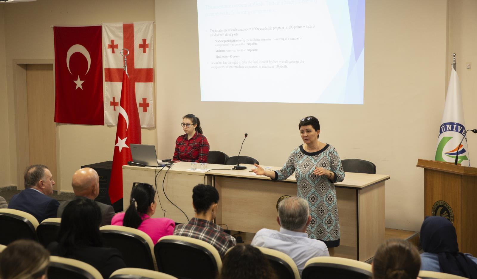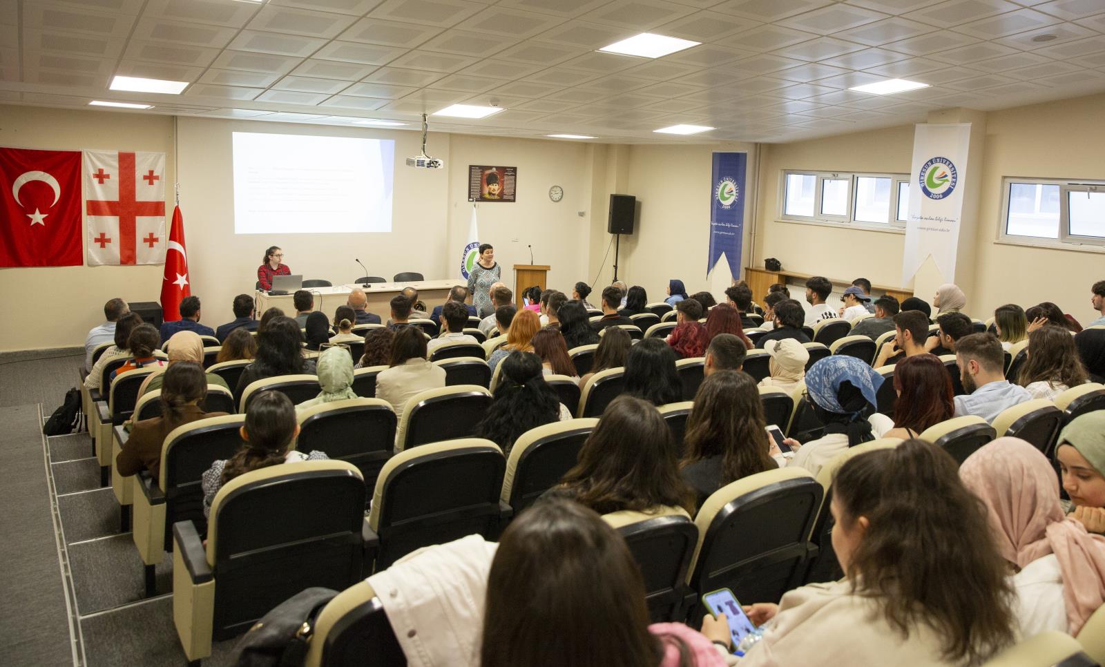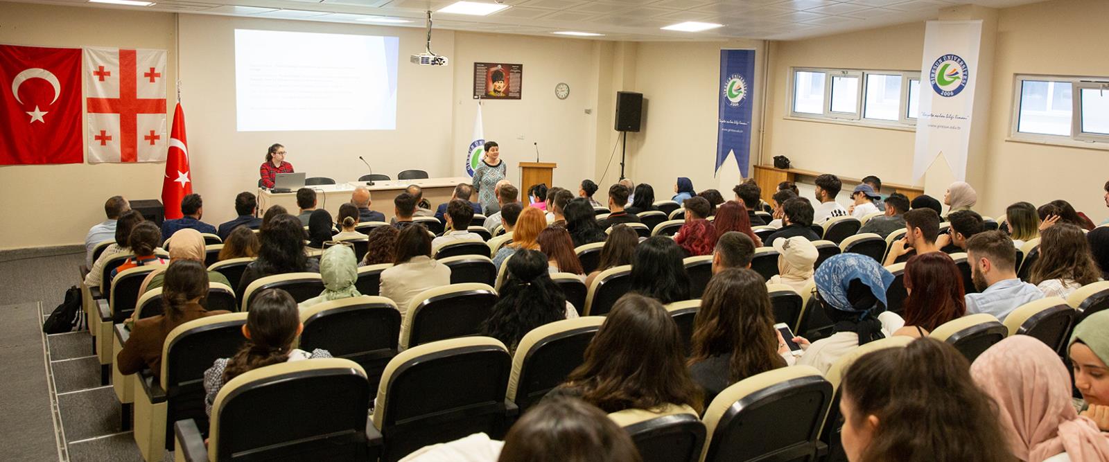 Yabancı Diller Yüksekokulu Müdürü ve İngiliz Dili ve Edebiyatı Bölümü öğretim üyesi Prof. Dr. Vedi AŞKAROĞLU ile bölümler arası işbirliği görüşmeleri gerçekleştiren heyet üyeleri daha sonra, GRÜ İngiliz Dili ve Edebiyatı Bölümü öğrencilerine yönelik düzenlenen “Gürcistan’da Lisansüstü Eğitim” konulu konferansa katıldılar. Programda konuşan, Akaki Tsereteli State University Lisansüstü Program Müdürü Prof. Dr. Maia ALAVIDZE, Gürcistan’da yükseköğretim olanakları hakkında öğrencilere bilgi verdi.