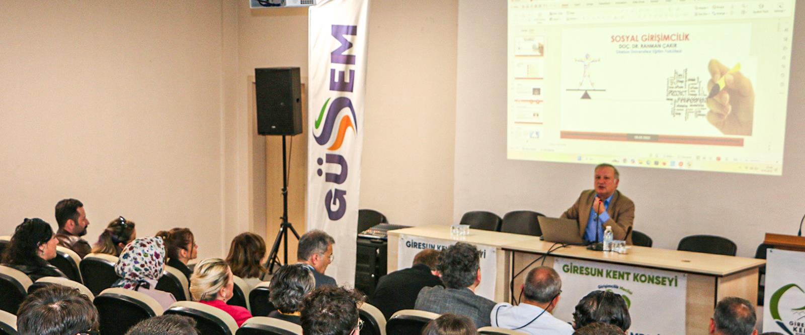 Giresun Üniversitesi Güre Kampüsünde gerçekleşen etkinlikte açılış konuşmasını Giresun Kent Konseyi Girişimcilik Meclisi Başkanı Prof. Dr. Kurtuluş Yılmaz GENÇ yaptı. Prof. Dr. GENÇ konuşmasında, sosyal girişimciliğin, kâr amacı gütmeden, kalkınmanın, toplumsal dengenin, adaletin sağlanması ve toplumun her kesiminin refahtan dengeli pay alabilmesi için gerçekleştirilen girişimcilik faaliyetleri olduğunu belirtti. Prof. Dr. GENÇ, Doç. Dr. Rahman ÇAKIR’ın Giresun’da, kurduğu dernek ve gerçekleştirdiği projelerle sosyal girişimciliğe önemli katkılarda bulunduğunu ve özellikle proje konusunda Giresun’da akla ilk gelen isimlerden olduğunu vurguladı. Sonrasında söz alan Doç. Dr. Rahman ÇAKIR, sosyal girişimciliğin temelinde toplumsal sorunlara, toplumun gereksinimlere olan duyarlılığın ve bu sorunları çözmek için gönüllü çalışmanın olduğunu belirtti. Sosyal girişimcilik sürecinde elde edilen ticari gelirin, ana misyon doğrultusunda, ilgili toplum kesiminin gereksinimlerinin giderilmesi ve genel olarak toplum için, kamu yararı için harcandığını ifade etti. Doç. Dr. Rahman ÇAKIR, Dünya’dan ve Türkiye’den sosyal girişimcilik örnekleri verdi ve gençlere tavsiyelerde bulundu. Gençlerin toplumun geleceği olduğunu belirten Doç. Dr. ÇAKIR, gençlerin kendi potansiyellerinin farkında olmalarının önemini vurguladı; kendileri ve toplum için hep en iyisini hedeflemeleri gerektiğini söyledi.