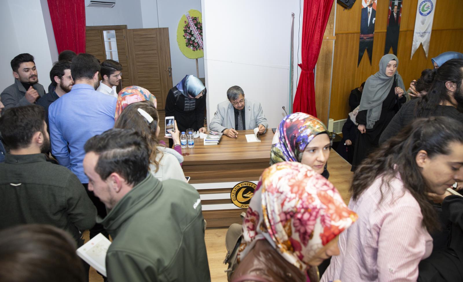 TÜGVA il temsilcisi Muhammed Anıl Kaya’nın program sonunda çeşitli hediyeler takdim ettiği Hayati İnanç, dana sonra Rektörlük Fuaye salonunda hayranları için kitap imzaladı.