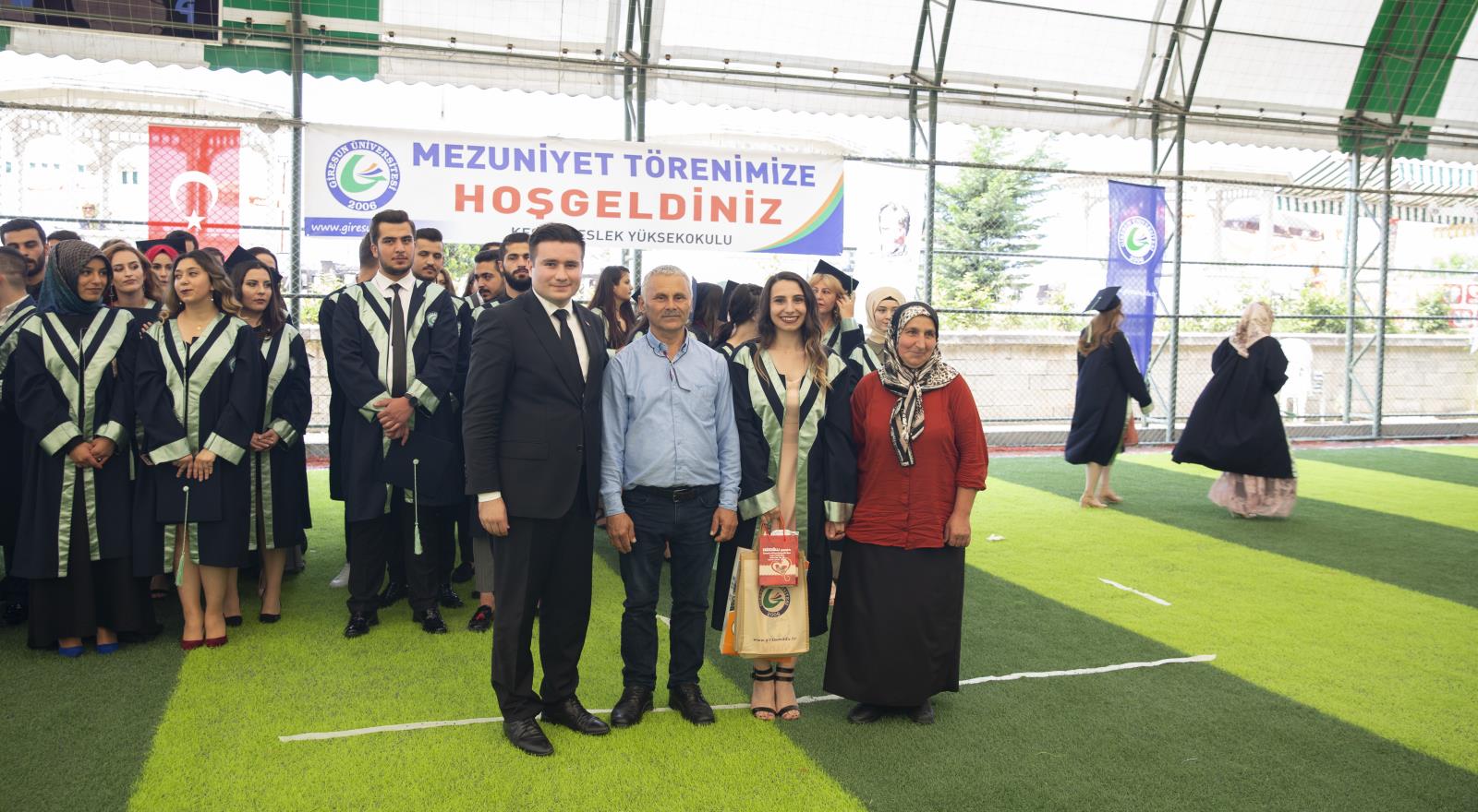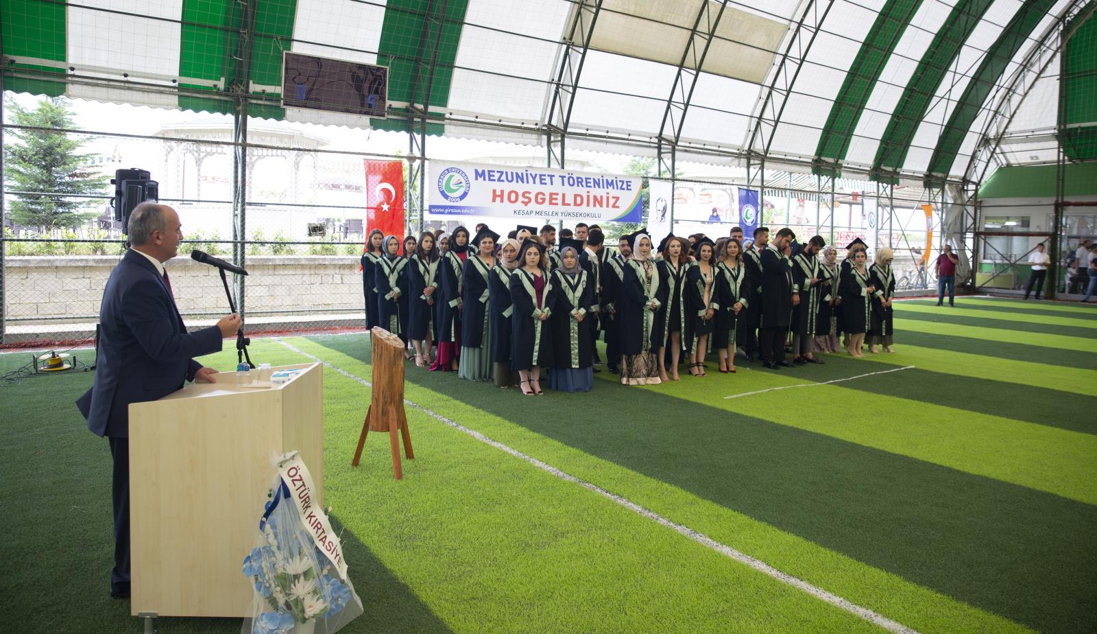 Giresun yöresi halk oyunları gösterileriyle başlayan tören programı, okul birincisi Emlak ve Emlak Yönetimi Bölümü öğrencisi Zeynep Altın’ın mezun öğrenciler adına yaptığı konuşma ile devam etti. Daha sonra kürsüye çıkan Yüksekokul Müdürü Dr. Öğr. Üyesi Beytullah Dönmez, mezun öğrencileri tebrik ederek konuşmasına başladı. Yüksekokul olarak öğrencilerini çalışma hayatına tam donanımlı hazırlamak için gayret sarf ettikleri belirten Dönmez, öğrencilerin ailelerine ve hocalarına teşekkür ederek sözlerini noktaladı.