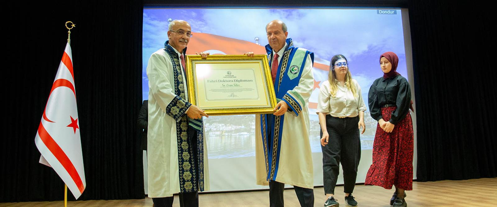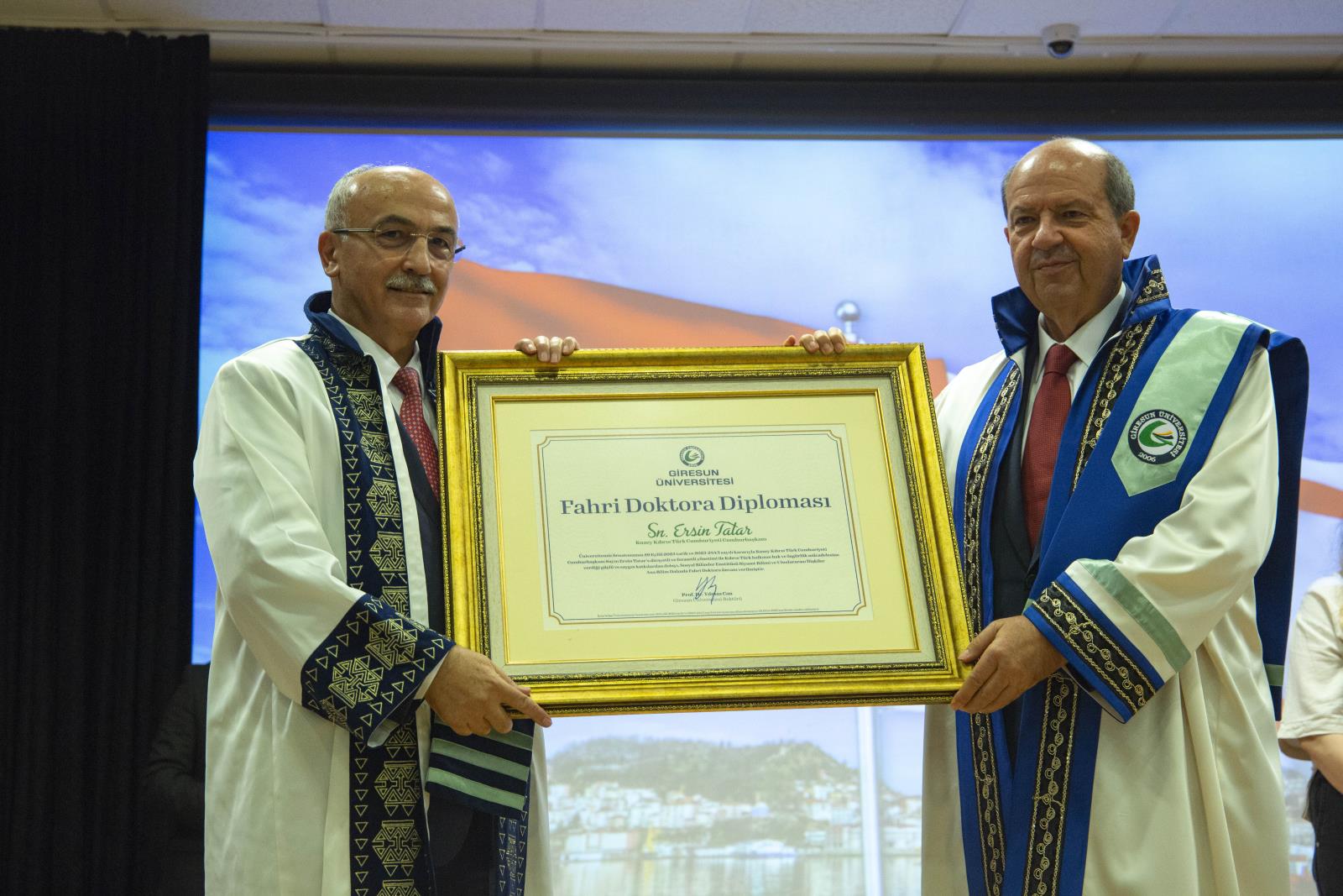 Fahri diploma tevcih töreninde ilk olarak Rektörümüz Prof. Dr. Yılmaz Can söz alarak, Cumhurbaşkanı Ersin Tatar'a, dirayetli ve ferasetli yönetimi ile Kıbrıs Türk Halkının hak ve özgürlük mücadelesine verdiği güçlü ve saygın katkılarından dolayı, Giresun Üniversitesi Senatosu'nun 29 Eylül 2023 tarih ve 2023-244/1 sayılı kararı doğrultusunda, Sosyal Bilimler Enstitüsü Siyaset Bilimi ve Uluslararası İlişkiler Ana Bilim Dalı tarafından fahri doktora ünvanı verildiğini açıkladı.