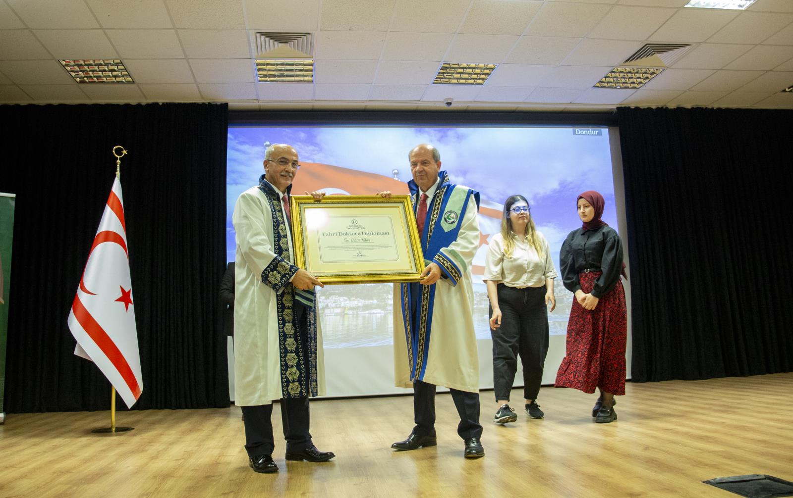 Kuzey Kıbrıs Türk Cumhuriyeti Cumhurbaşkanı Ersin Tatar'ın özgeçmişinin okunmasının ve Kıbrıs davasında verdiği mücadeleyi anlatan filmin gösteriminin ardından fahri diploma tevcih törenine geçildi.
