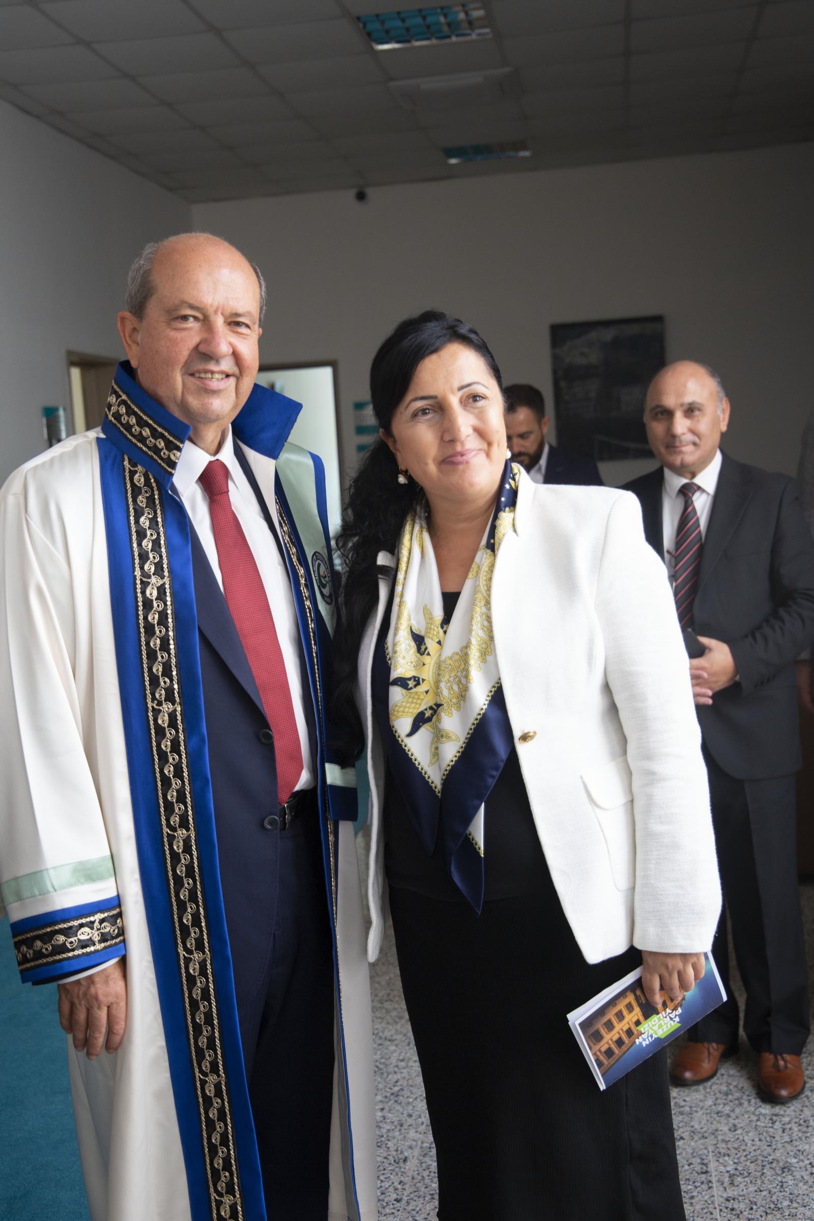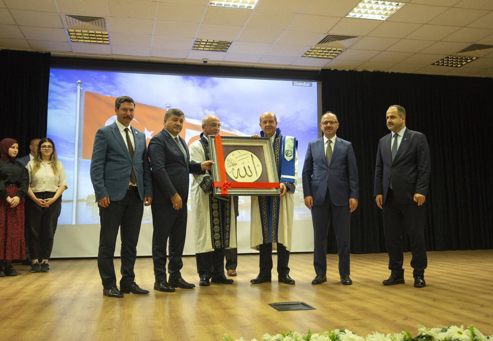 Rektörümüz Prof. Dr. Yılmaz Can tarafından akademik cübbe giydirilen Cumhurbaşkanı Ersin Tatar'a daha sonra yine Rektörümüz tarafından fahri doktora diploması tevcih edildi.