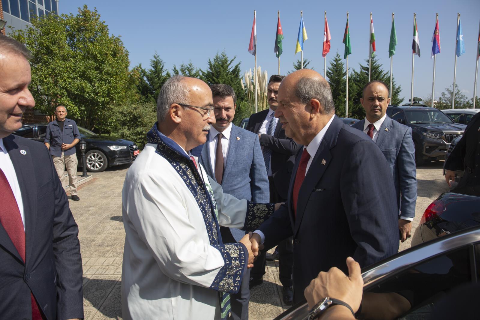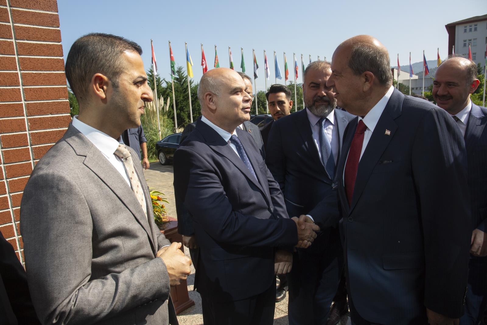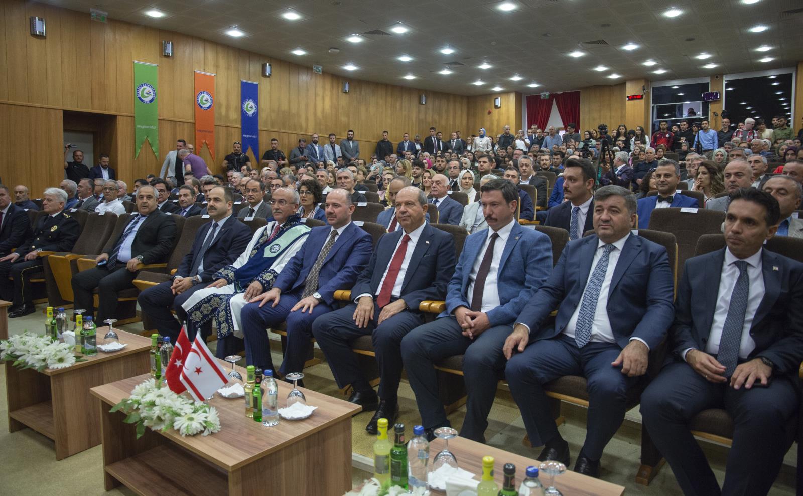Rektörlük binası önünde Rektörümüz Prof. Dr. Yılmaz Can ve Rektör Yardımcılarımız Prof. Dr. Güven Özdem ile Prof. Dr. Hüseyin Şahin tarafından karşılanan Cumhurbaşkanı Ersin Tatar, diploma tevcih töreninin ardından, Şehit Ömer Halisdemir Konferans Salonunda "KKTC'nin Türk Dünyası İçerisindeki Stratejik Önemi" konulu bir konferans verdi.