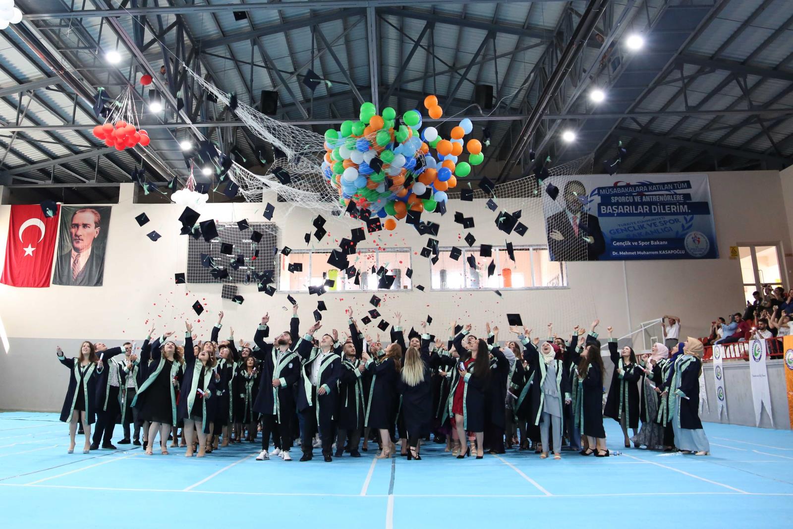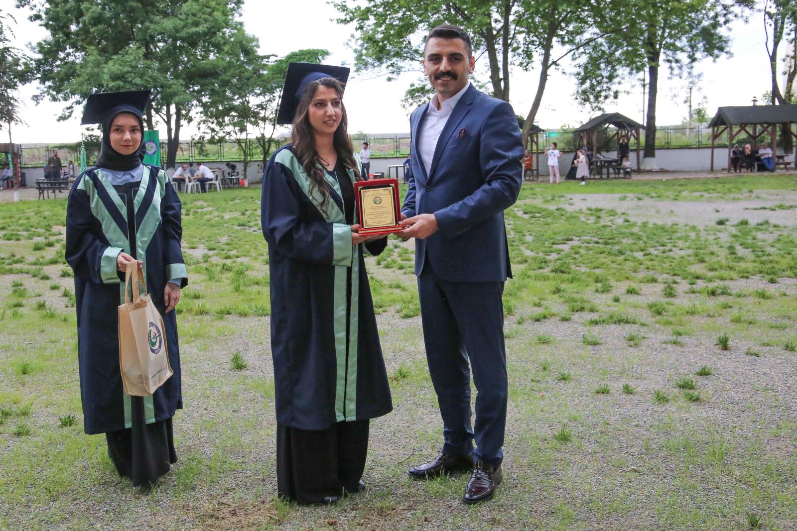 Konuşmaların ardından dereceye giren öğrencilere teşekkür plaketi ve hediyelerin takdim edilmesiyle devam eden mezuniyet programı, kep töreniyle sona erdi.