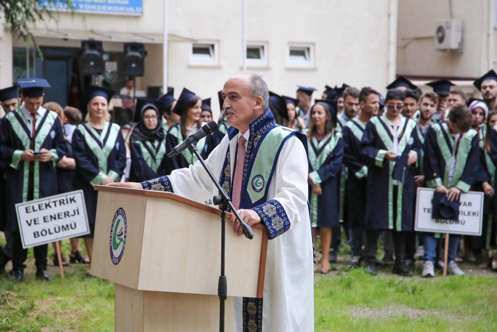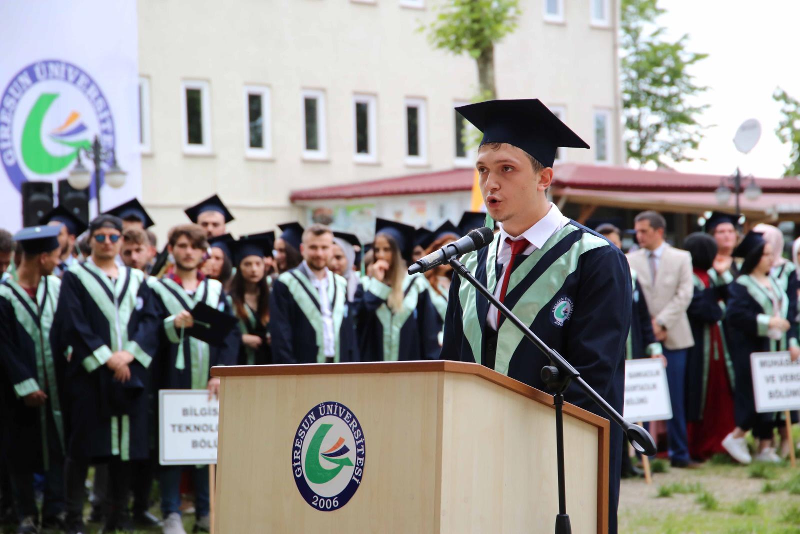 Okul birincisi Feyza Nur Ceylan’ın mezun öğrenciler adına yaptığı konuşmasının ardından Yüksekokul Müdürü Doç. Dr. Hüseyin Şahin de kısa bir tebrik konuşması yaptı. Espiye Kaymakam Vekili ve aynı zamanda Görele Kaymakamı Erdoğan Turan Ermiş’in mezun öğrencileri tebrik ettiği konuşmasıyla devam eden programda daha sonra Rektörümüz Prof. Dr. Yılmaz Can kürsüye çıktı.