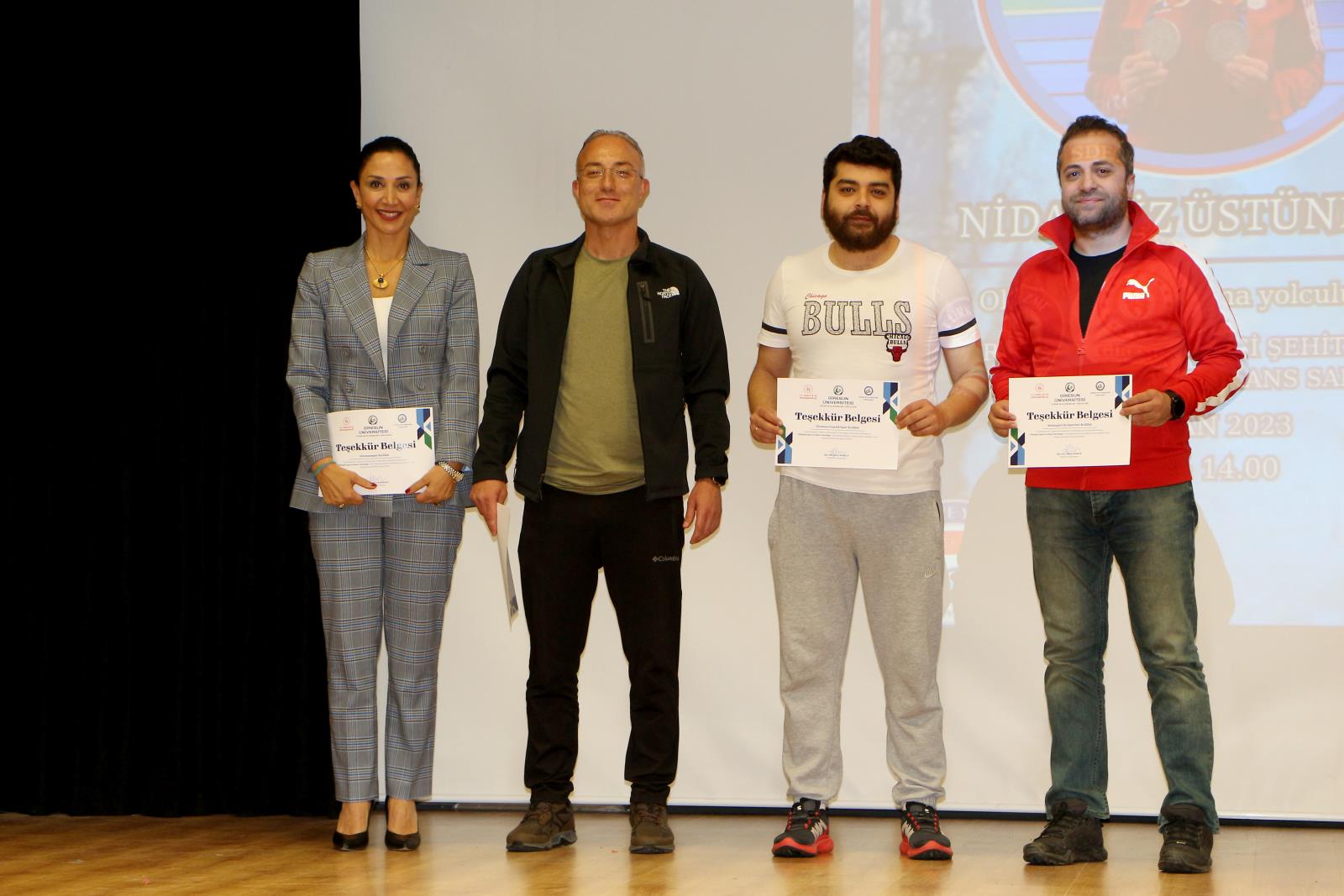 Gençlik ve Spor İl Müdürü V. Muzaffer Ergün ve Üniversitemiz Yüzme ve Su Sporları Topluluk başkanı Ufuk Erdoğan tarafından Milli Sporcuya plaket takdim edilirken, Türkiye Milli Olimpiyat Komitesi (TMOK) Boğaziçi Organizasyon Komitesi Üyesi ve Yüzme İl Temsilcisi Heves Bozbağ tarafından ilimiz Yüzme ve Sutopu Antrenörlerine teşekkür belgesi takdim edildi.