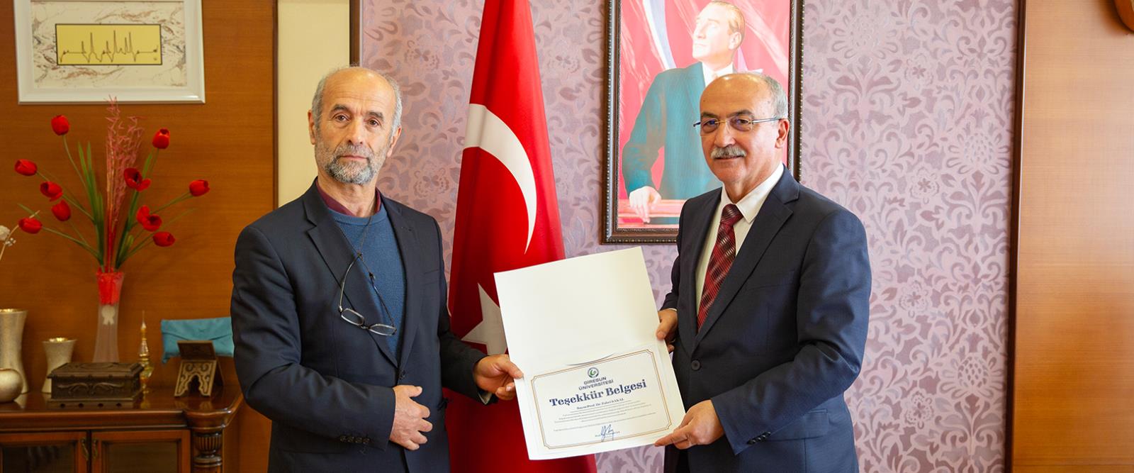 Bu anlamlı davranışı sebebiyle Sayın Fahri SAKAL'ı makamında kabul eden Rektörümüz Prof. Dr. Yılmaz CAN, kendisine teşekkür etti. Üniversite kütüphanesinin bu anlamlı bağışlarla daha da zenginleştiğini dile getiren Rektörümüz, günün anısına hazırlanan teşekkür belgesini Sayın SAKAL'a, takdim etti.