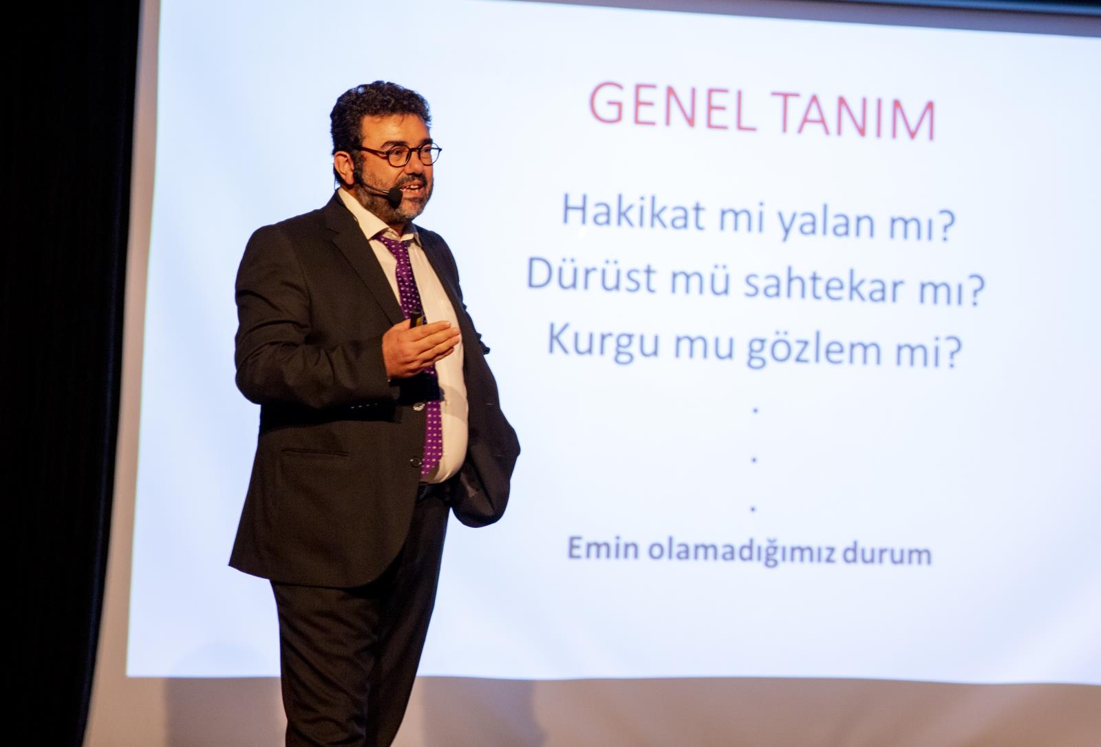 Güre Yerleşkesi Şehit Ömer Halisdemir Konferans Salonunda düzenlenen etkinliğe, Rektör Yardımcısı Prof. Dr. Hüseyin ŞAHİN, akademik ve idari personelin yanı sıra çok sayıda öğrenci katıldı. Program öncesinde kısa bir konuşma yapan Rektör Yardımcısı Prof. Dr. Hüseyin ŞAHİN, günümüzde insanların gerçek ile çarpıtılmış gerçeklik arasında çok ciddi bir ikimle yaşamak zorunda kaldıklarına işaret ederek, bu türden konferanslar yoluyla insan kalitesinin yükseltilmesinin ve düşünen, sorgulayan, bilinçli nesiller yetiştirmenin mümkün olduğunu vurguladı.