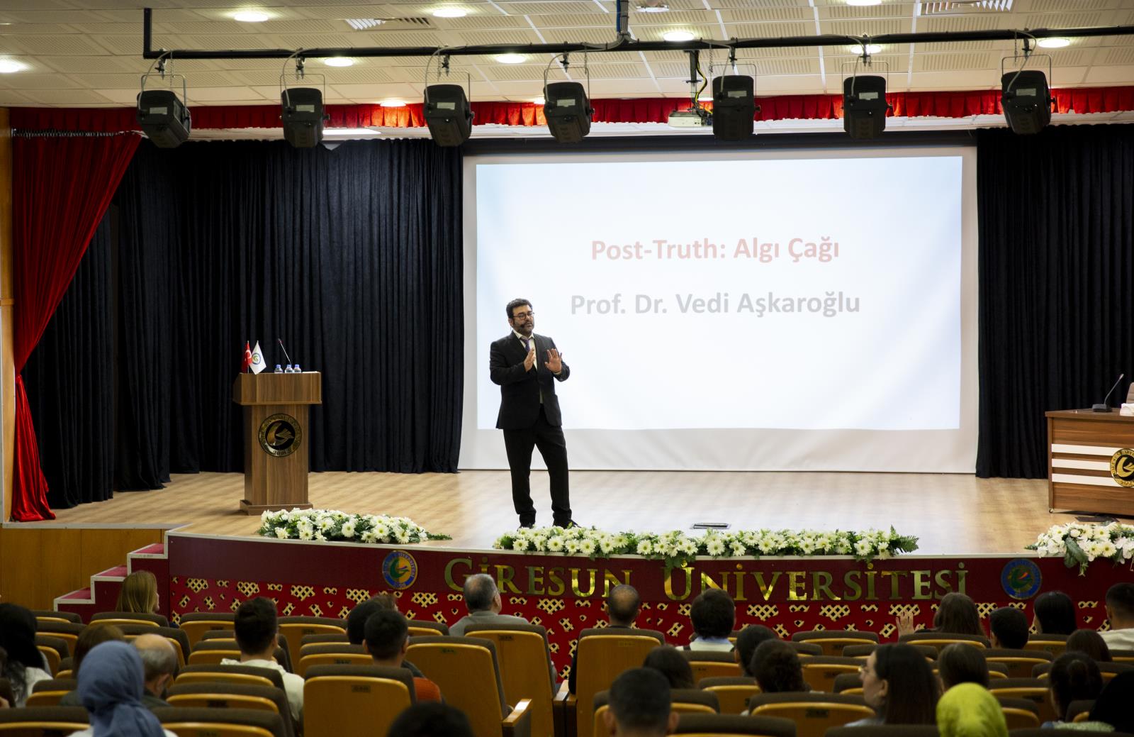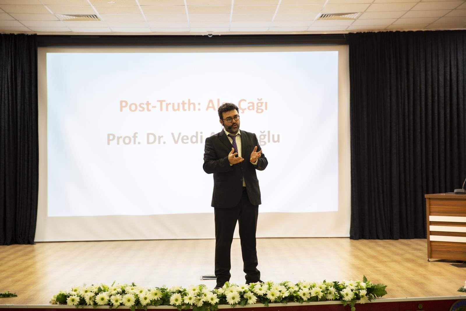 Sayın ŞAHİN’in ardından kürsüye çıkan Prof. Dr. Vedi AŞKAROĞLU, gerçeğin eski dönemlerden günümüze kadarki süreçte nasıl tanımlandığını, tasnif edildiğini, türlerini, hangi alanlarda kullanıldığını sistematik biçimde sundu. Sırasıyla “pistis” toplumu ile “episteme” toplumunun niteliklerini karşılaştırdıktan sonra, “Platonik gerçek” ile “Aristocu gerçek”, “çoklu gerçek”- “kurgusal gerçek”, “modernist gerçek”-“postmodern gerçek” – “post-truth gerçek” başlıkları arasındaki ilişkileri tartışarak çeşitli örneklerle görüşlerini ortaya koydu.