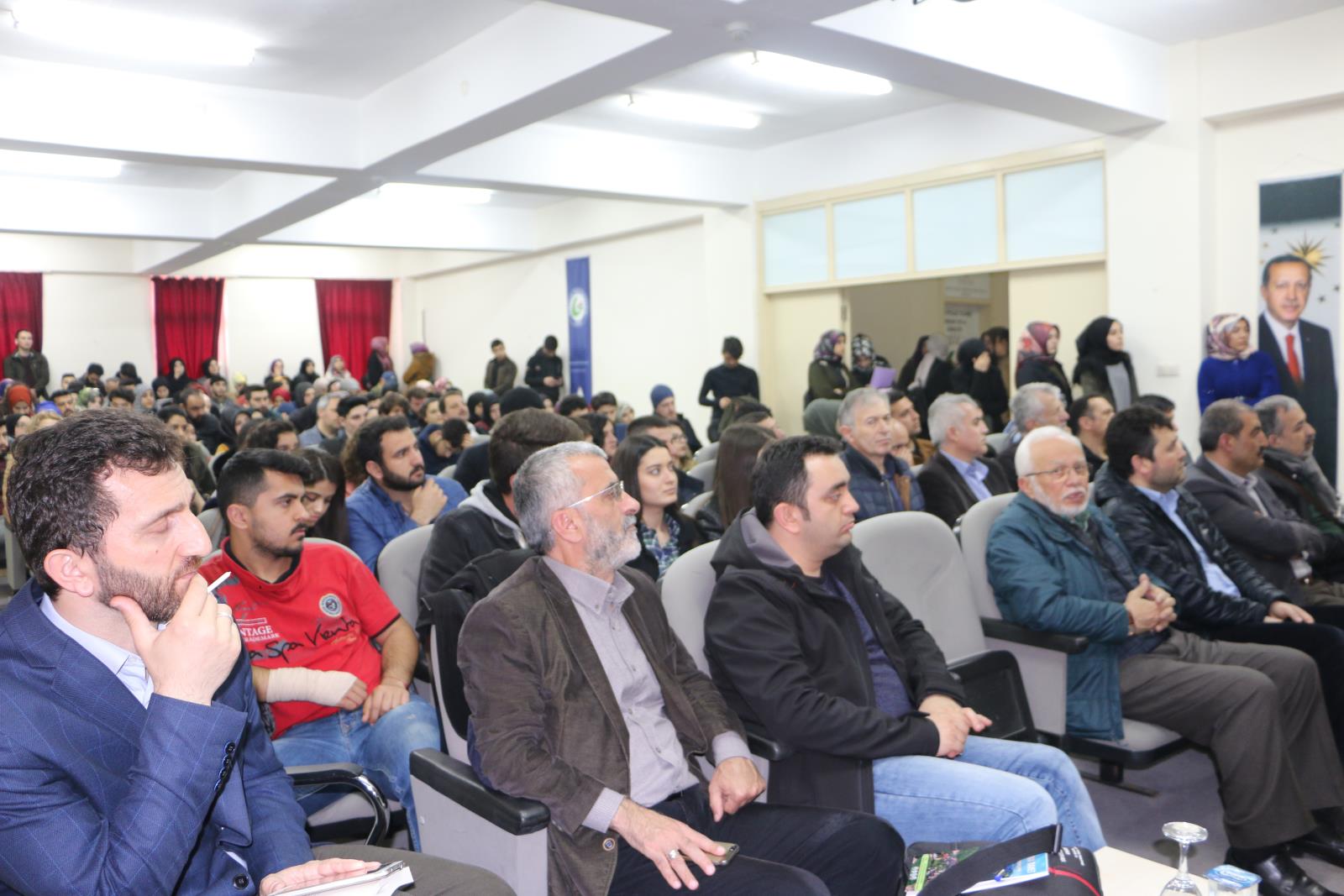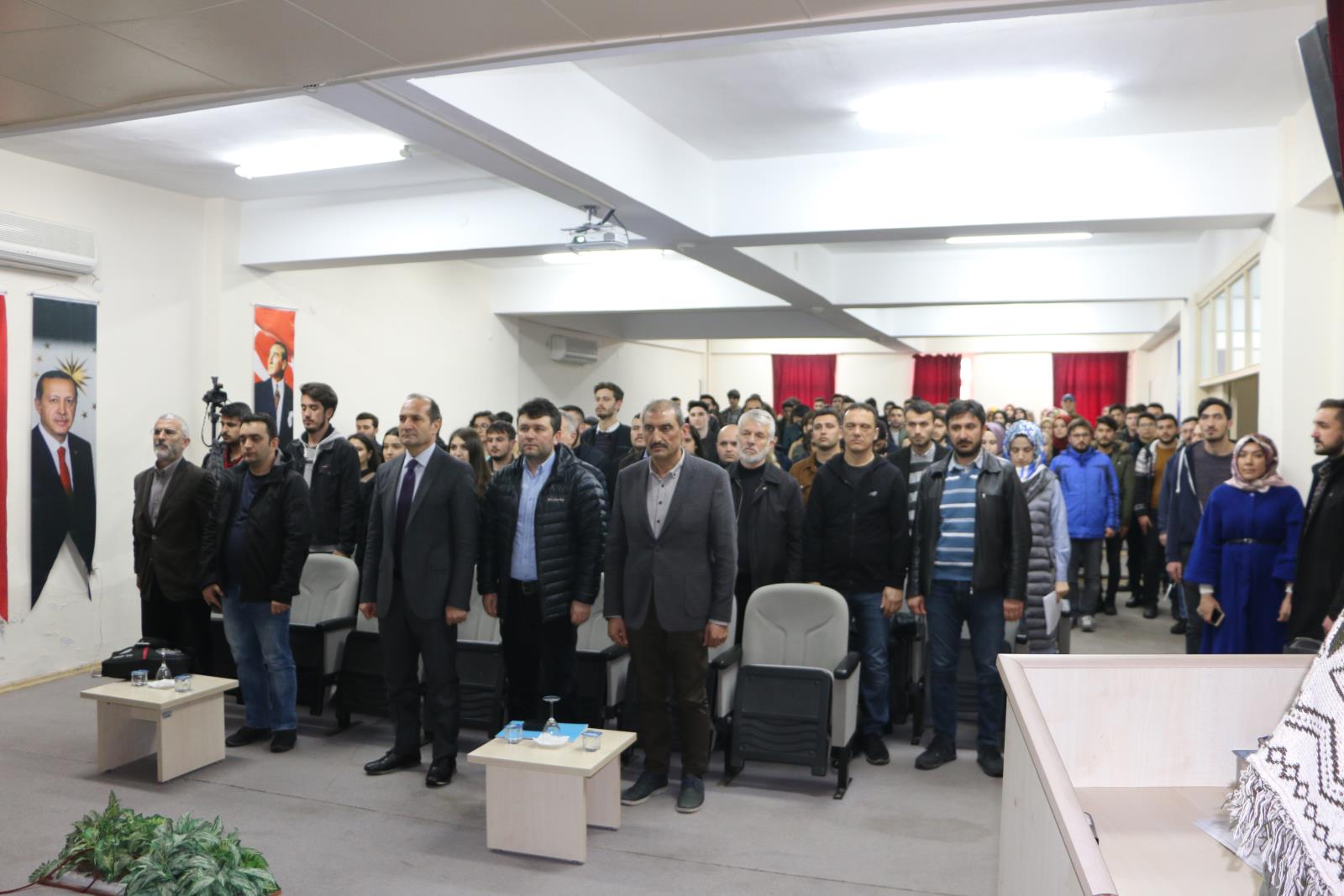 Eğitim Fakültesi Karadeniz Konferans Salonunda, saygı duruşu ve İstiklal Marşı’mızın okunmasıyla başlayan program, Sosyal ve Siyasal Araştırmalar Topluluğu Akademik Danışmanı Doç. Dr. Mehmet Özmenli’nin konuşmalarıyla devam etti.