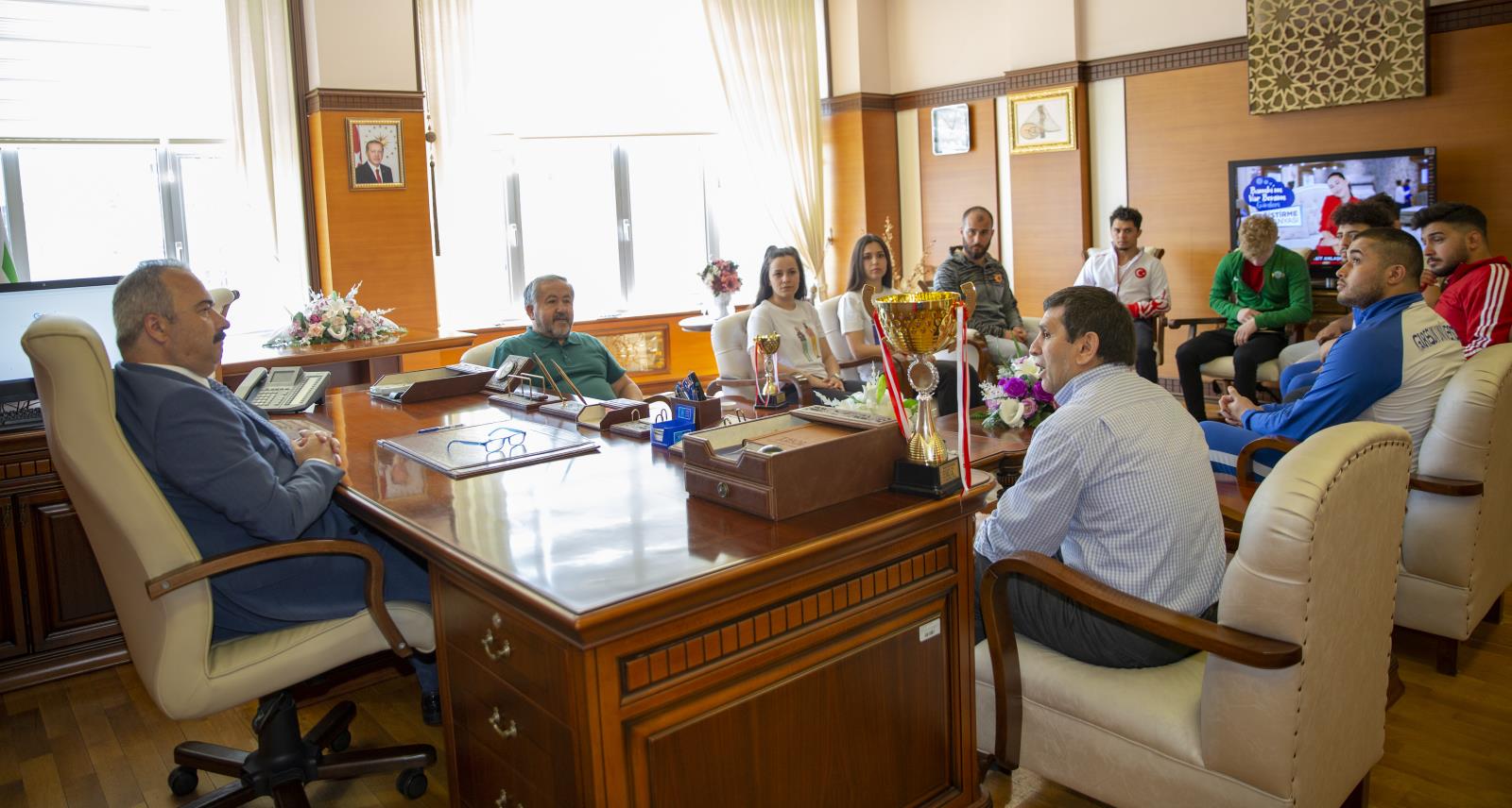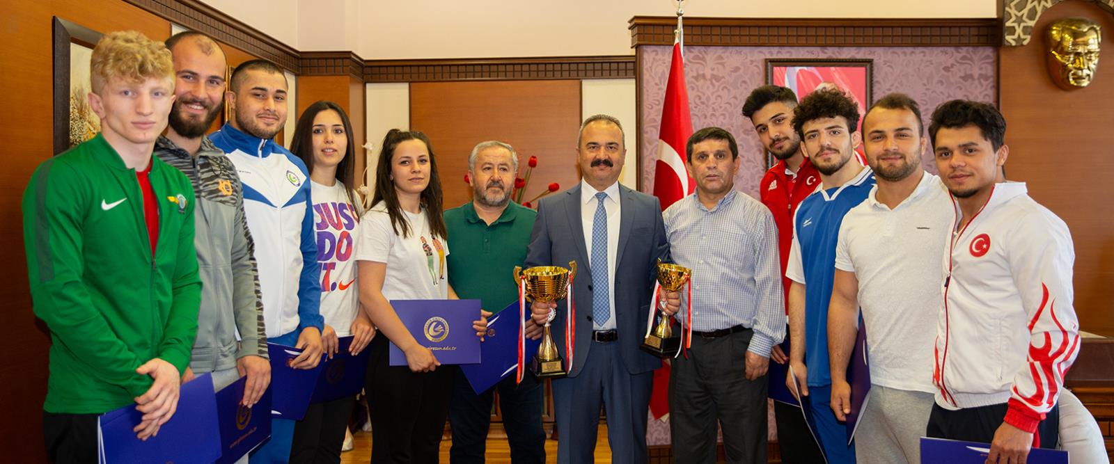Takım antrenörleri Doç. Dr. Şevki Kolukısa ve Dr. Öğr. Üyesi Halil Çolak ile sporcuları, elde ettikleri başarıdan dolayı kutlayan Rektörümüz, Giresun Üniversitesinin adını farklı alanlarda başarıyla temsil eden ekip üyelerine teşekkür belgesi takdim etti.