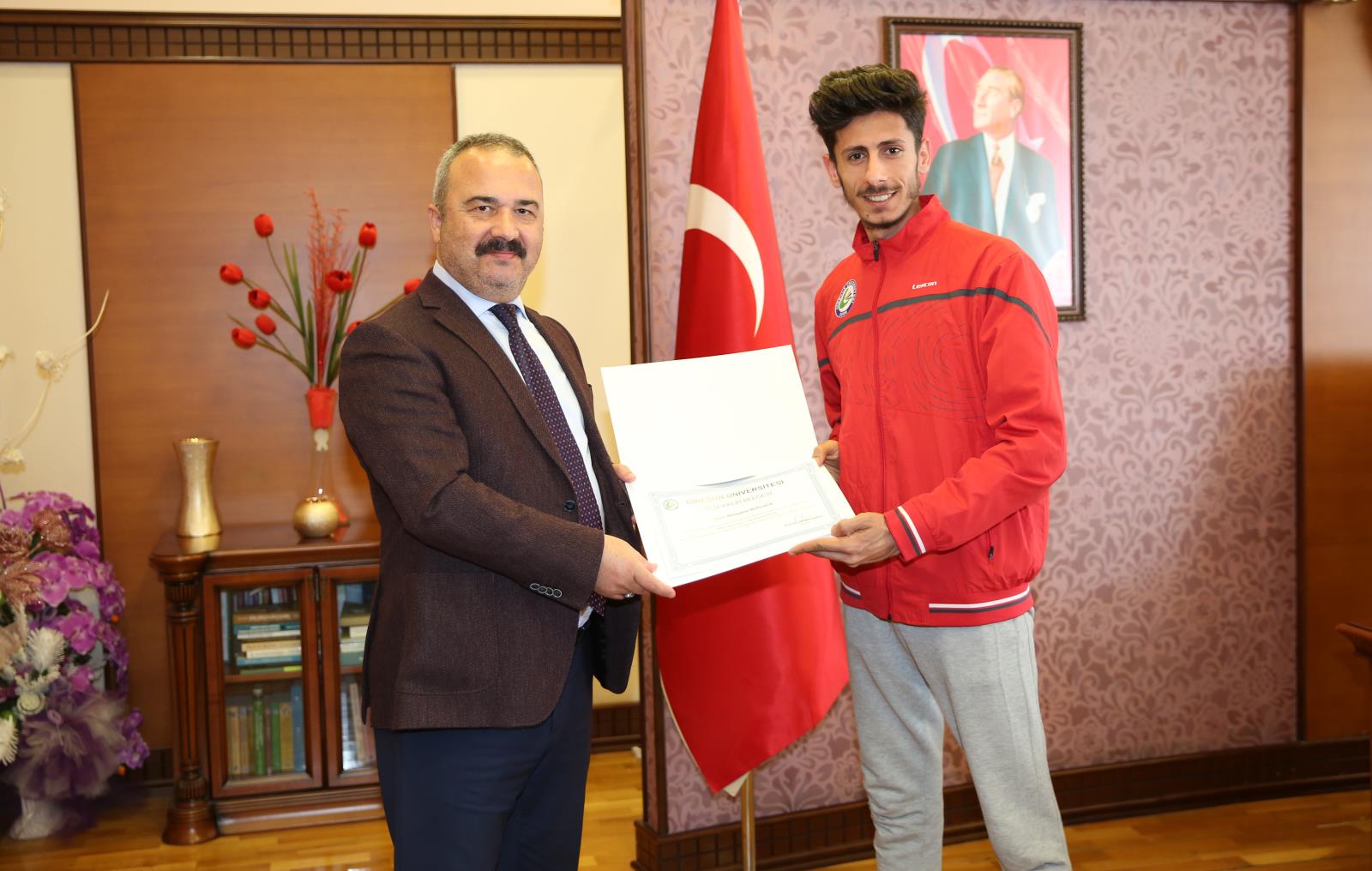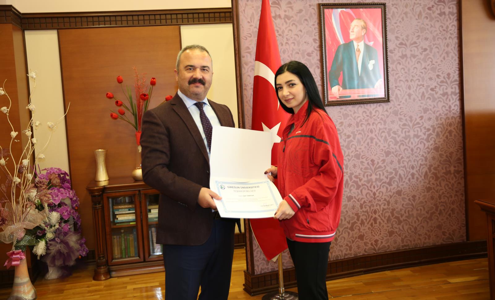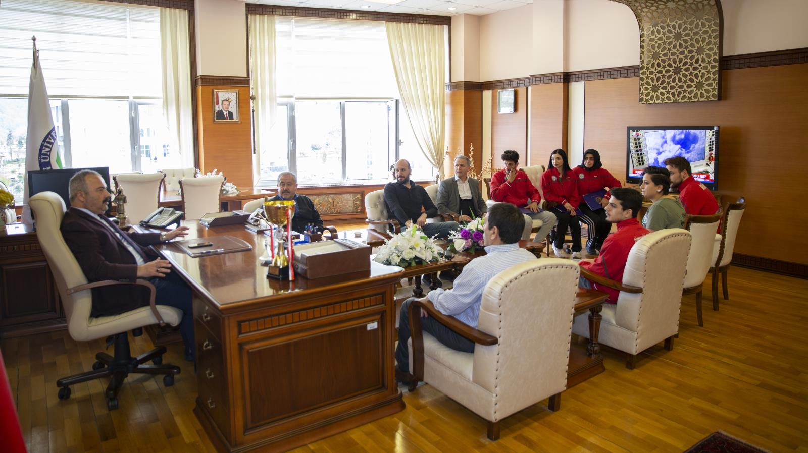 Takımların antrenörlüğünü yapan ve aynı zamanda Üniversitemiz Fen-Edebiyat Fakültesi Sekreterliğini yürüten Erol Can eşliğinde Rektörlük makamına gelen takım üyelerini tek tek tebrik eden Prof. Dr. Cevdet Coşkun, GRÜ adını başarıyla temsil eden sporculara teşekkür belgesi verdi.