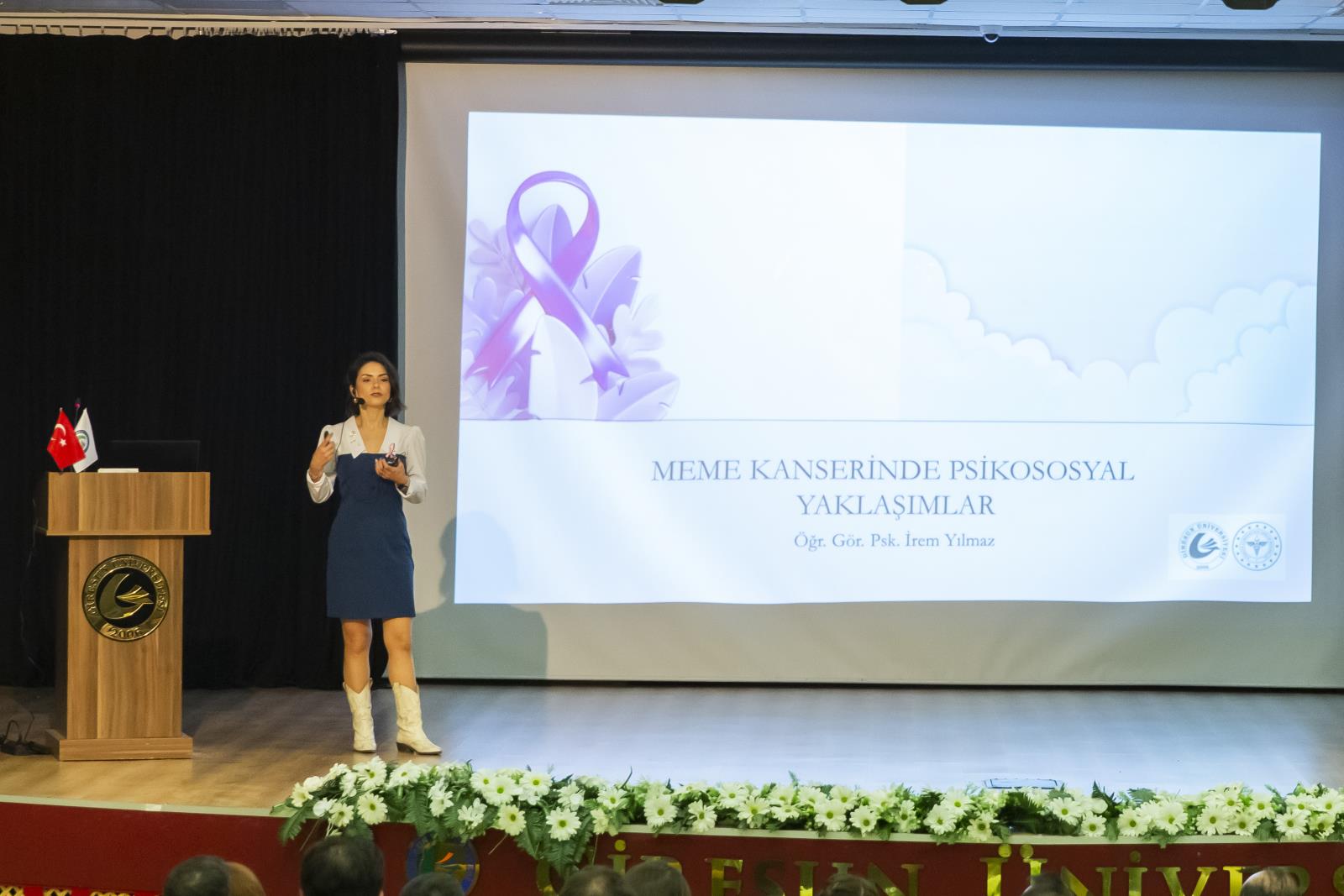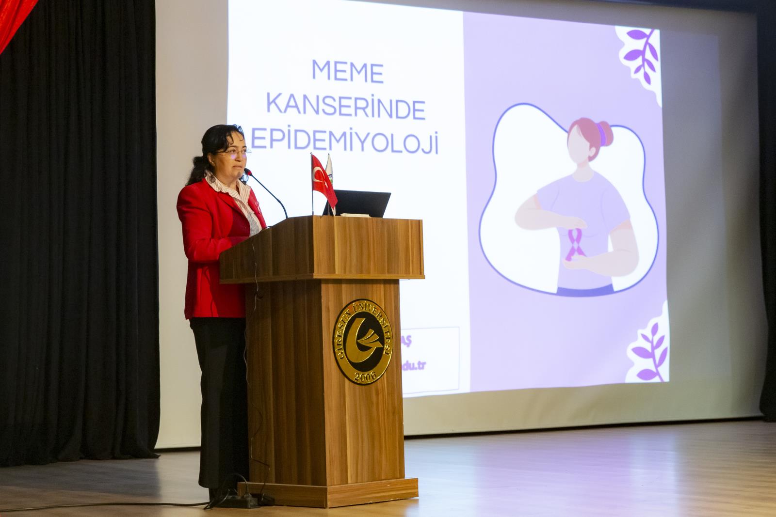Ardından, Sağlık Bilimleri Fakültesi Cerrahi Hastalıkları Hemşireliği Anabilim Dalı öğretim üyesi Prof. Dr. Yeşim Yaman Aktaş, meme kanseri risk faktörlerini ve korunma yollarını anlatarak yaşam tarzı, obezite ve beslenme alışkanlıklarının hastalık gelişimindeki rolünü vurguladı.