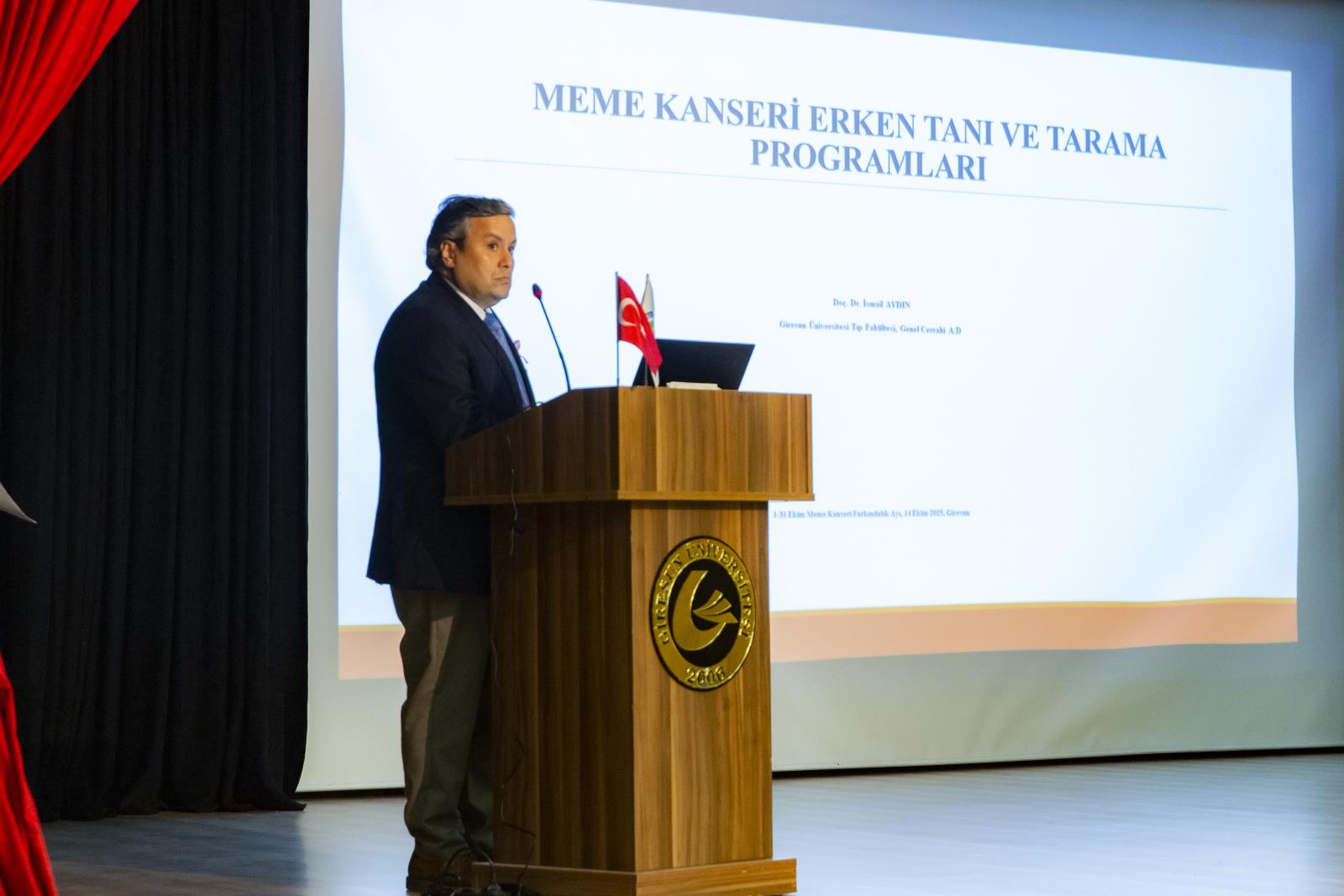 Üçüncü konuşmacı olarak Tıp Fakültesi Genel Cerrahi Anabilim Dalı öğretim üyesi Doç. Dr. İsmail Aydın, Türkiye’de yürütülen ulusal tarama programları, mamografi, klinik meme muayenesi (KMM) ve kendi kendine meme muayenesi (KKMM) uygulamaları hakkında bilgiler sundu.