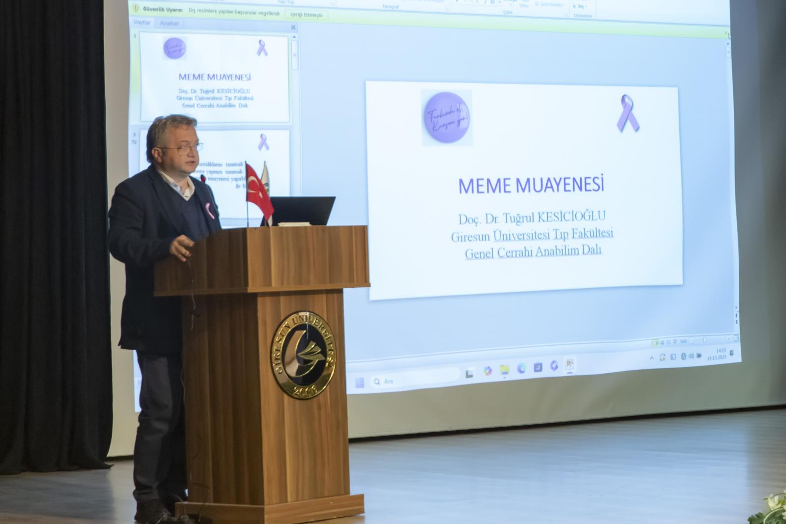 Sonrasında Tıp Fakültesi Genel Cerrahi Anabilim Dalı öğretim üyesi Doç. Dr. Tuğrul Kesicioğlu, meme muayenesi yöntemleri ve klinik uygulamaları üzerine bilgi paylaşarak, kadınların kendi meme yapısını tanımasının erken teşhis açısından önemini vurguladı.