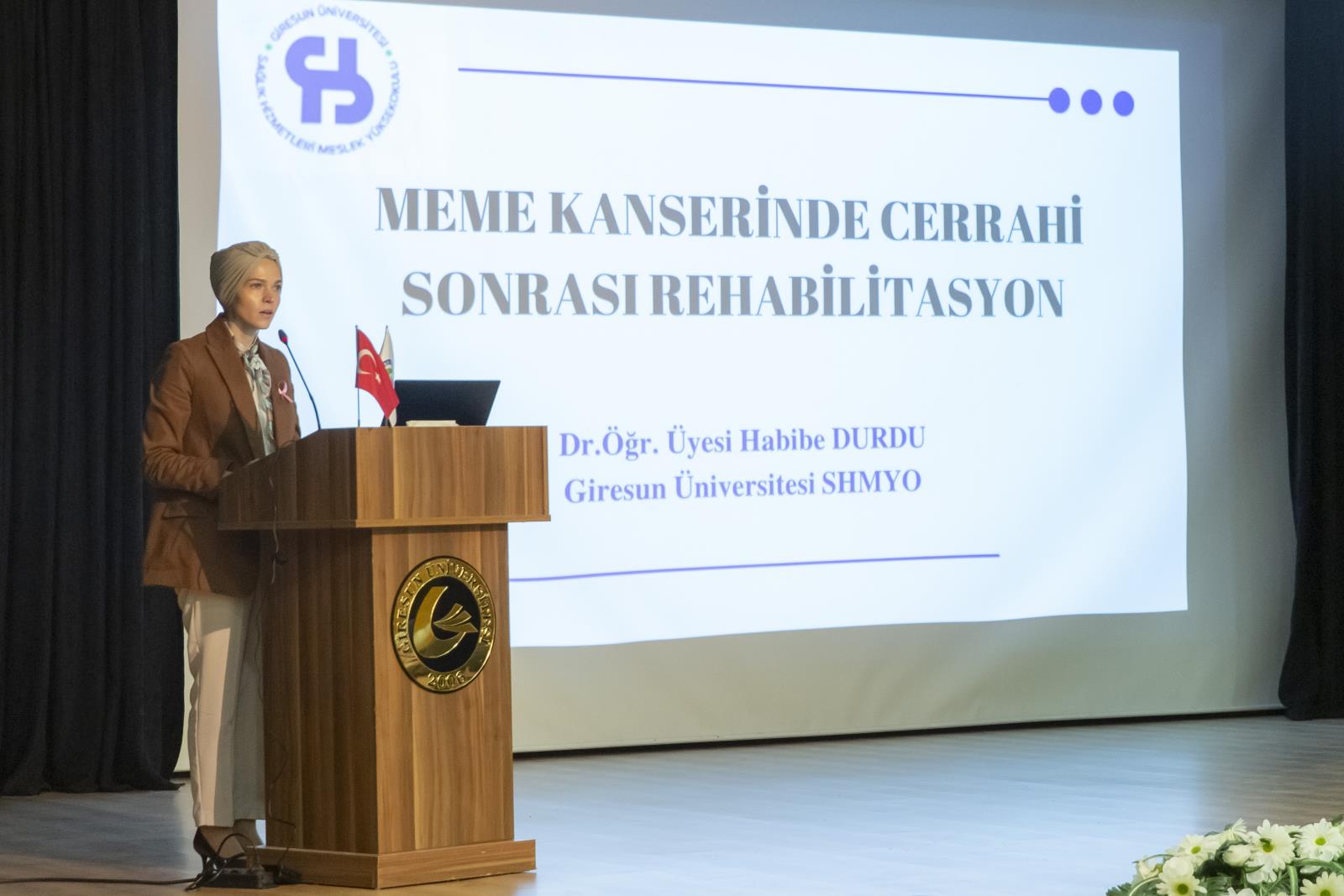 Etkinliğin son konuşmasını yapan Sağlık Hizmetleri Meslek Yüksekokulu Yaşlı Bakımı Programı öğretim elemanı Öğr. Gör. İrem Yılmaz, meme kanserinin psikolojik etkileri, sosyal destek ve psikososyal müdahale modelleri hakkında bilgiler verdi. Öğr. Gör. Yılmaz, hastalık sürecinin sadece biyolojik değil, aynı zamanda duygusal ve sosyal bir süreç olduğunu ifade etti.