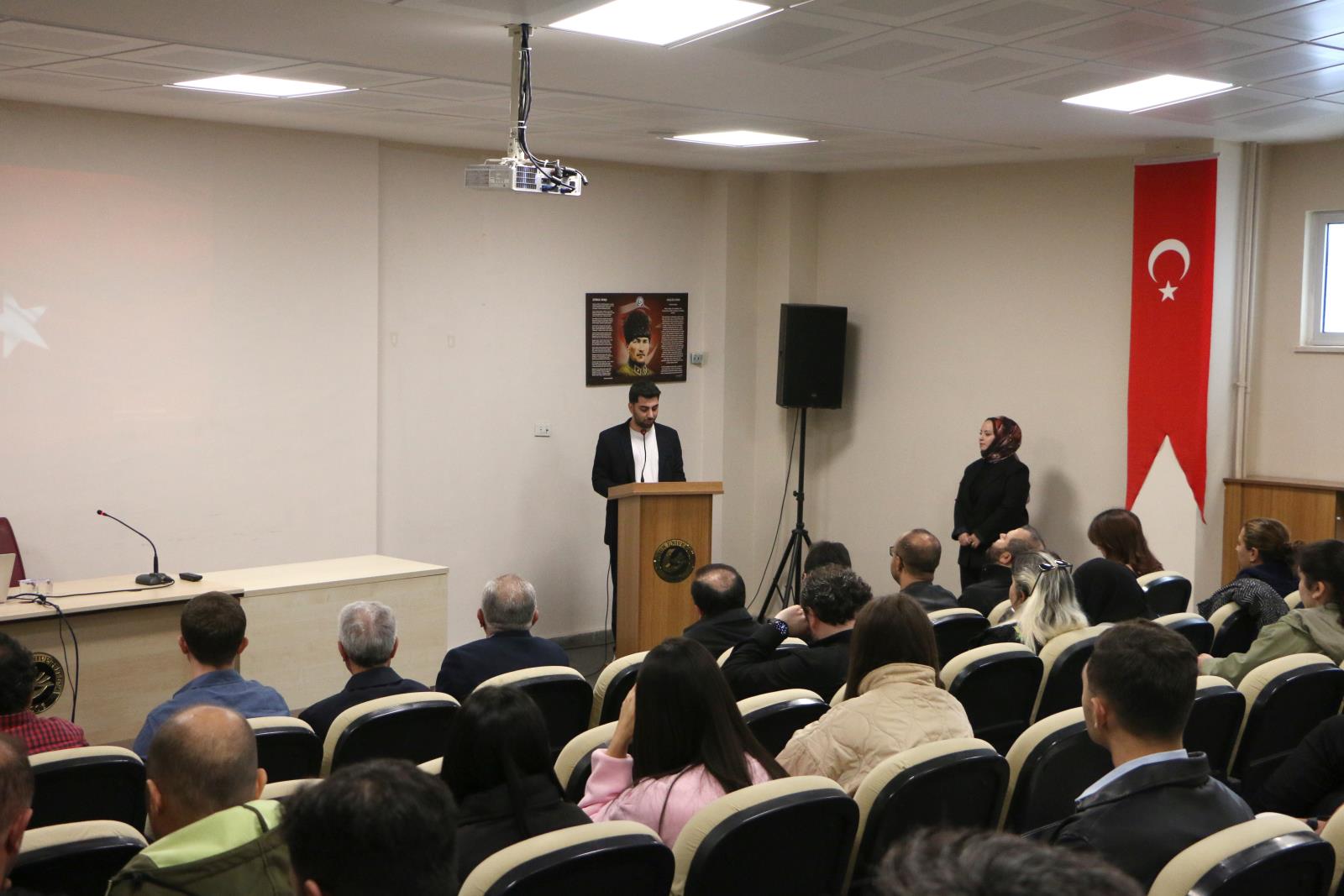 Tarih Topluluğu üyesi Sevde Nur PATAN’ın sunuculuğunu yaptığı program, saygı duruşu ve İstiklal Marşı’mızın okunması ile başladı.