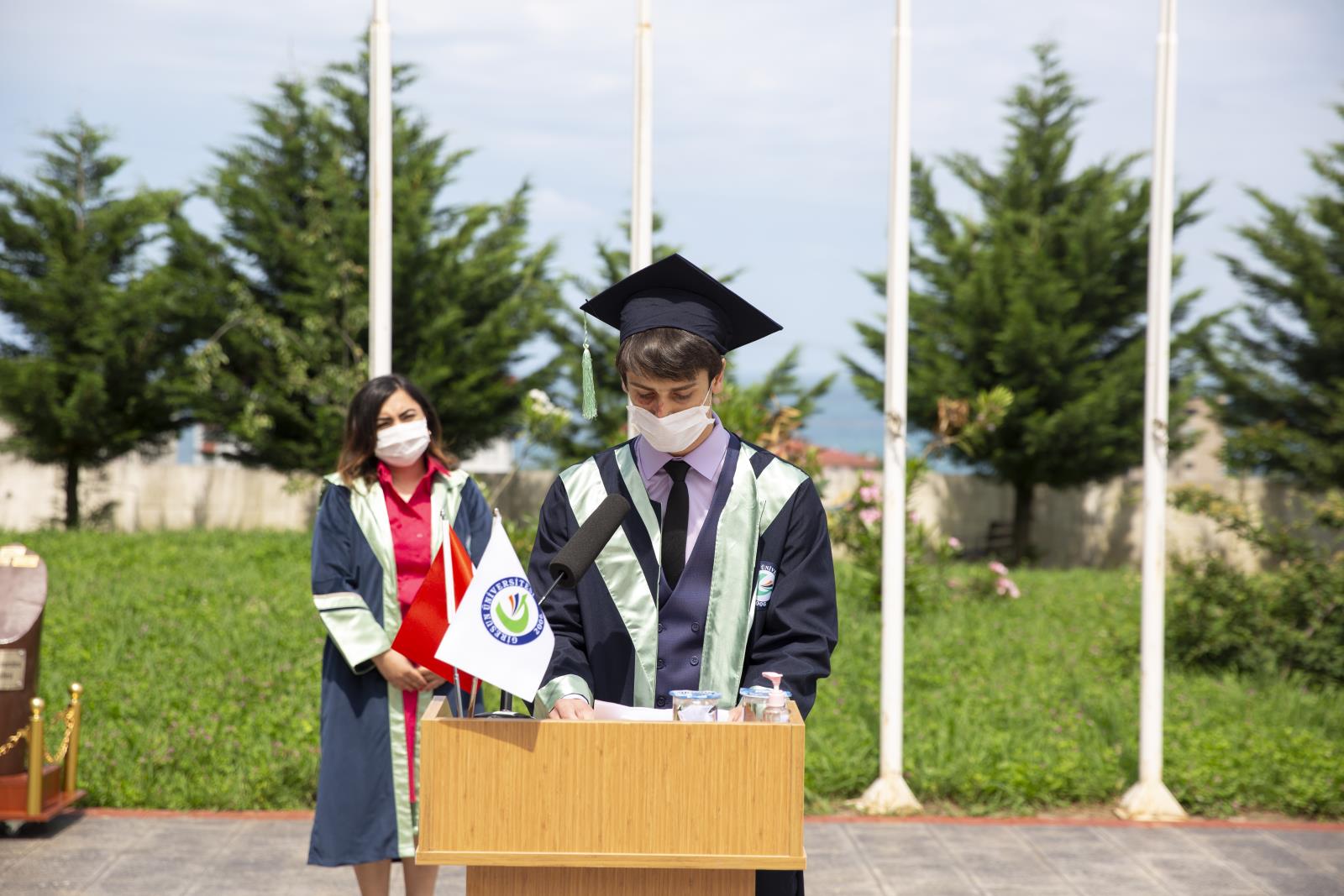 Saygı duruşu ve İstiklal Marşı’nın okunmasının ardından dönem birincisi sıfatıyla söz alan Emil YUNUSOV, ailelerinin salgın sebebiyle katılamadığı törenin bu haliyle de olsa kendilerini mutlu ettiğini ifade ederek, “bu güne gelmemizde emeği geçen başta hocalarımız olmak üzere herkese teşekkür ediyorum” dedi.