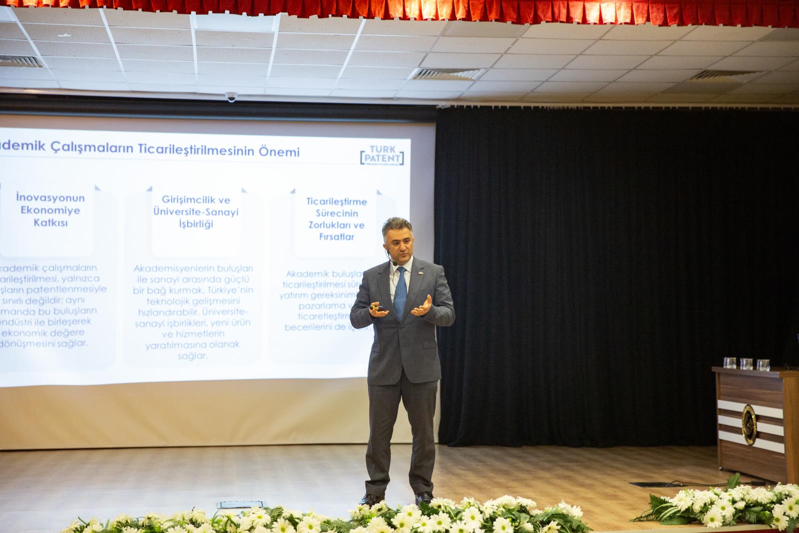 Açılış konuşmalarının ardından Türk Patent ve Marka Kurumu Başkanı Prof. Dr. Muhammed Zeki DURAK, "Sınai Mülkiyet ve Ticarileşme" başlıklı bir sunum gerçekleştirdi. Sayın DURAK sunumunda; akademisyen ve öğrencilerin yenilikçi fikirlerinin tescil süreçlerinin yanı sıra, bu buluşların ticarileşerek ekonomik bir değere dönüşmesinin önemine dikkat çekti. Patent ve faydalı model kavramlarının stratejik rolüne değinilen sunumda, üniversite-sanayi iş birliğinin gelecekteki ticarileşme fırsatları üzerine değerli bilgiler paylaşıldı.