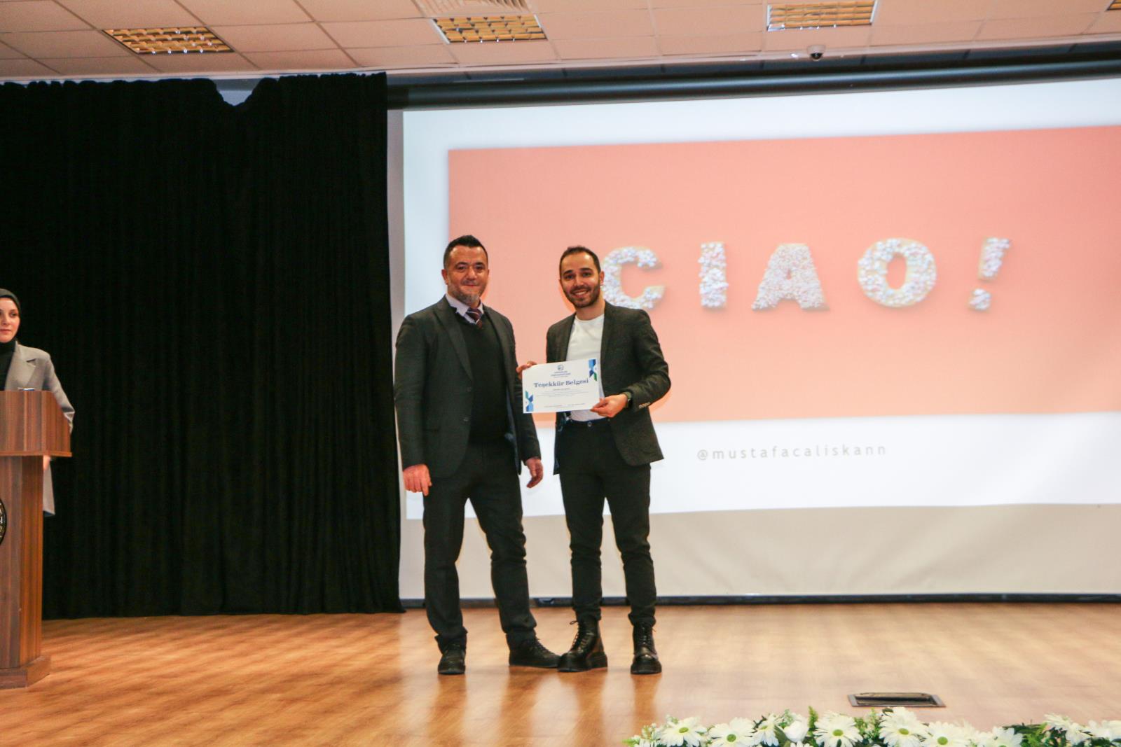 Program sonunda Topluluk Danışmanı Dr. Öğr. Üyesi Yüksel Bülbül tarafından Mustafa Çalışkan'a teşekkür belgesi takdim edildi. Toplu fotoğraf çekiminden sonra program sona erdi.